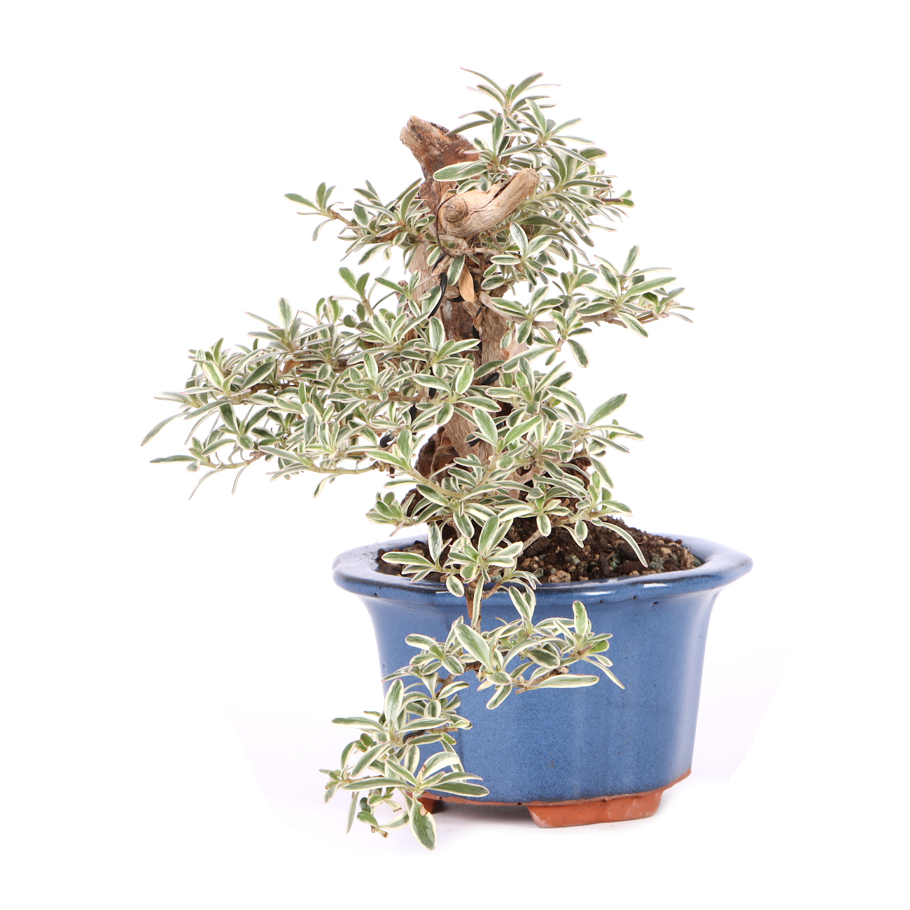 Koprosma ist eine Pflanzengattung mit über 100 verschiedenen Arten, die in Südost-Asien, Australien und den pazifischen Inseln verbreitet ist. Bei Koprosma ‘Variegata‘ handelt es sich um einen Hybriden, der aus einer Kreuzung der in Neuseeland beheimateten Coprosma acerosa und Coprosma repens hervorgegangen ist. Die Koprosma ‘Variegata‘ ist immergrün und hat lanzettliche dunkle Blätter, die durch den weißen und teilweise leicht rosa gefärbten Rand sehr dekorativ sind. Dadurch ist sie zu einer beliebten Zimmerpflanze geworden, die auch häufig als Bonsai angeboten wird.