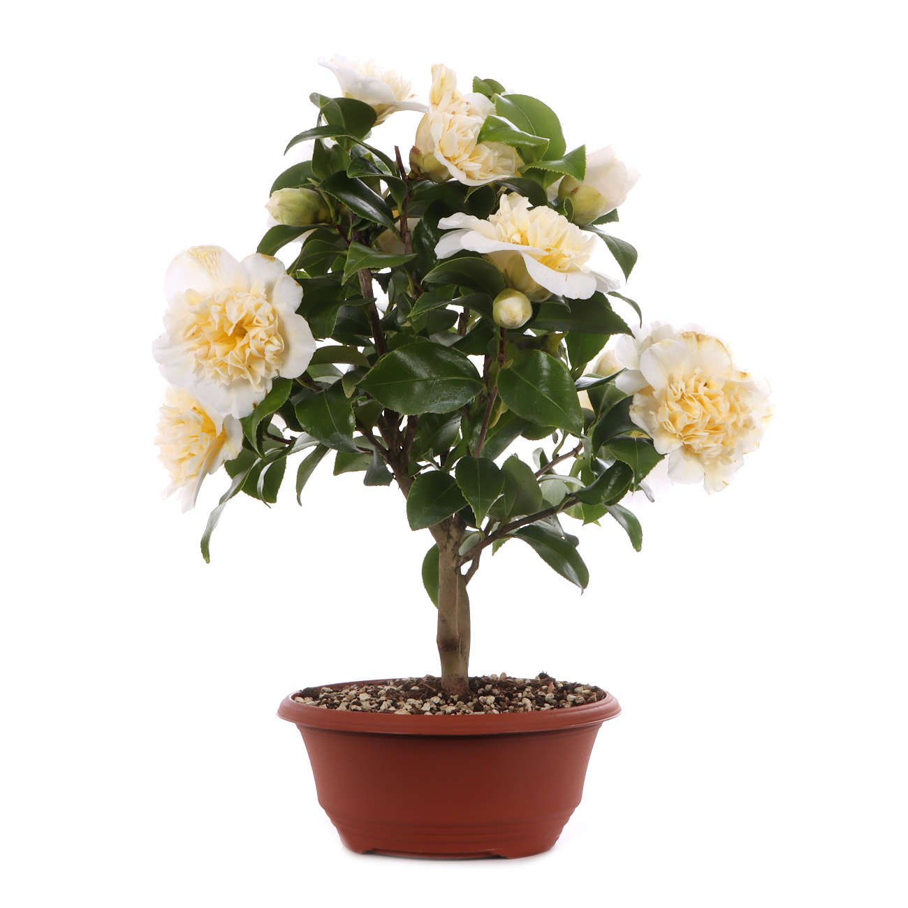 Kamelien sind in Japan durch ihre prachtvollen Blüten und die edel glänzenden Blätter beliebte Bonsai. Bei uns zählen sie aufgrund der Frostempfindlichkeit eher zu den Zimmer-Bonsai, wobei sie im Sommer auch sehr gut im Freien stehen. Hier bevorzugt die Kamelie dann einen halbschattigen, windgeschützten Platz ohne große Schwankungen in Bezug auf Temperatur und Feuchtigkeit. In der Hauptwachstumszeit ist auf eine gleichmäßige Bewässerung und regelmäßige Düngung zu achten. Da die Kamelie einen sauren Boden bevorzugt, sollte am besten mit kalkarmem Regenwasser gegossen und mit einem Dünger für Moorbeetpflanzen gedüngt werden. Auch bei der Erde sollte auf einen entsprechend niedrigen pH-Wert geachtet werden (z.B. TerraSai-Rhodo). Umgetopft werden Kamelien alle zwei bis drei Jahre im Juni oder Juli nachdem die frischen Triebe ausgebildet sind. Im Winterquartier sollte die Pflanze frostfrei stehen und im Frühjahr sollte die Temperatur hier nicht zu früh ansteigen. Grundsätzlich sollten Kamelien während der Blütezeit auch eher kühl gehalten werden.