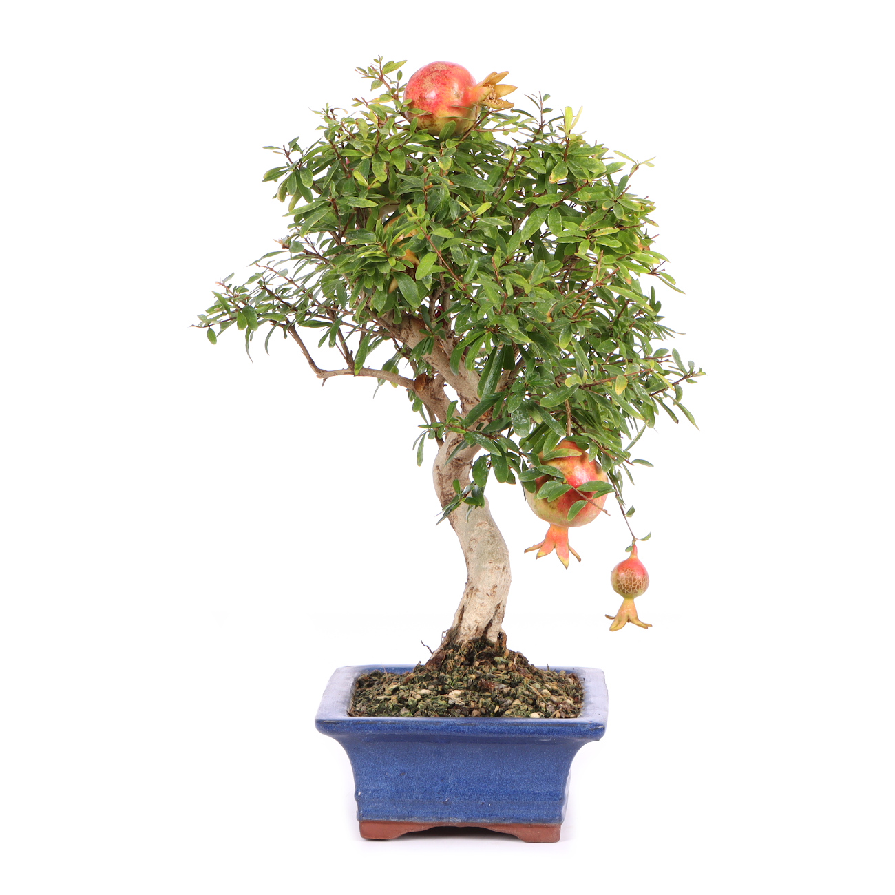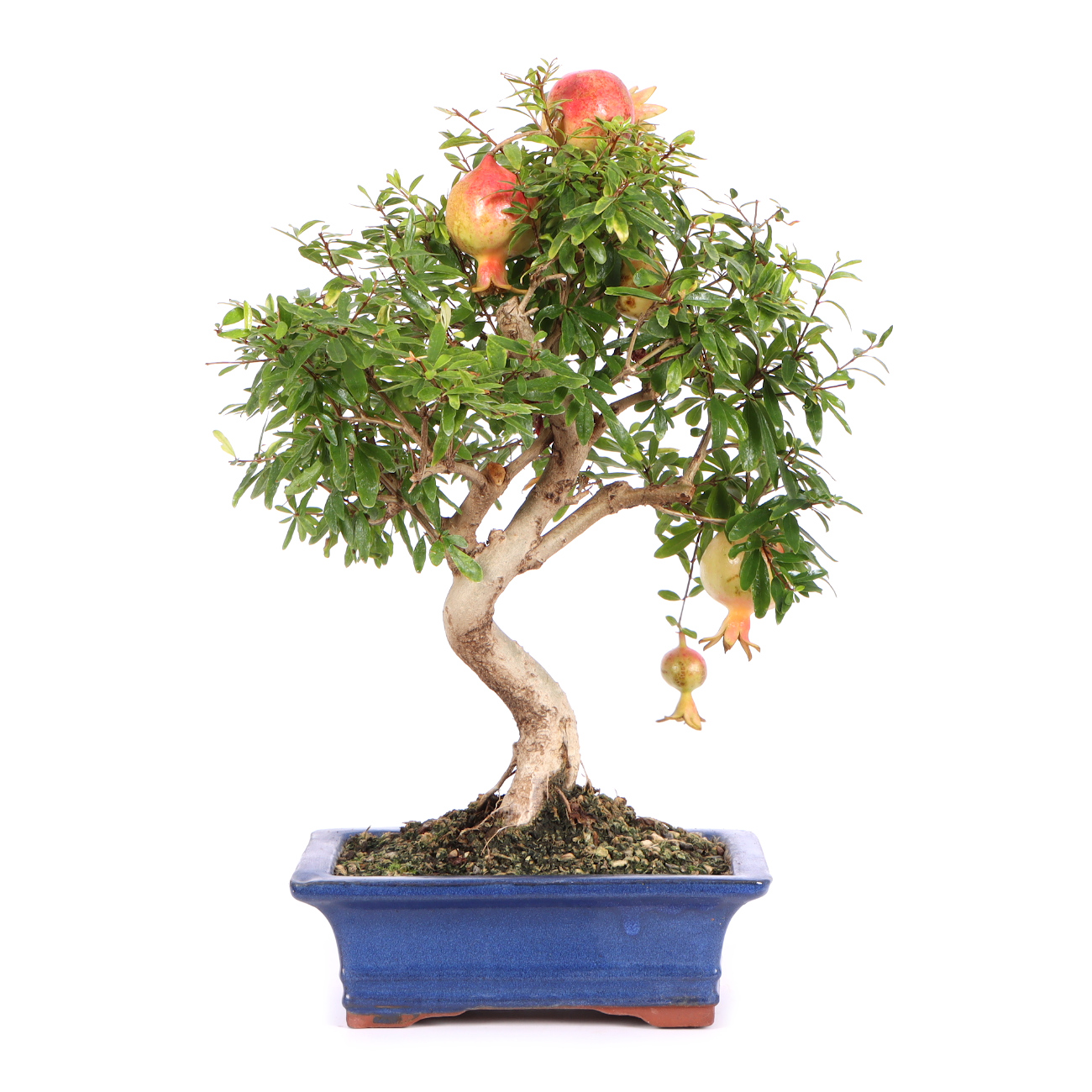Der Granatapfel zählt durch seine feinen hellgrünen Blätter, die hellorangenen Blüten und natürlich die sehr dekorativen Früchte zu einem sehr beliebten Zimmerbonsai. In der Pflege ist die Pflanze recht anspruchslos. Trotzdem sollte sie möglichst hell stehen und regelmäßig gegossen und gedüngt werden. Im Sommer kann der Granatapfel auch gut im Freien stehen. Die zahlreichen Triebe sollten konsequent zurückgeschnitten und überzählige entfernt werden. Für die Blüten- und Fruchtbildung sollten die Kurztreibe stehen gelassen werden. Im Winter reagieren die Pflanzen recht unterschiedlich. Es kann zu einer schönen Herbstfärbung und dem Abwurf sämtlicher Blätter. Diese Pflanzen sollten hell, aber kühl bei ca. 8°C überwintert werden. Solche Pflanzen, die ihr Laub behalten und weiterhin blühen und fruchten, können auch warm bei 20°C stehen.