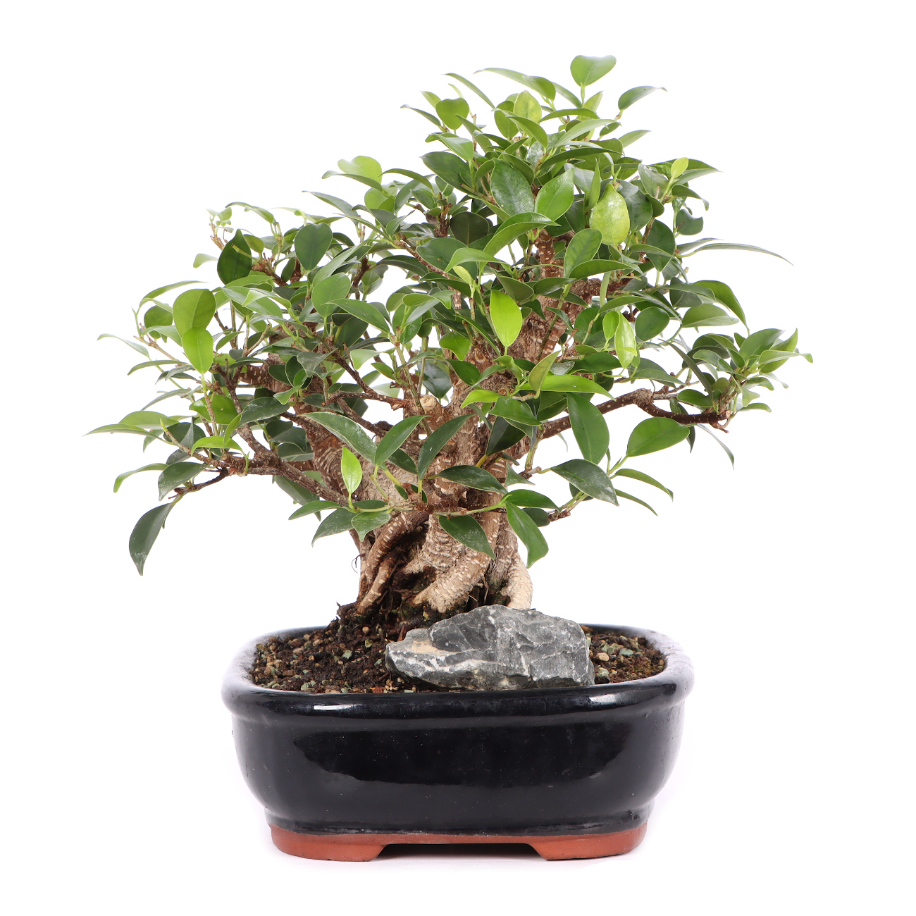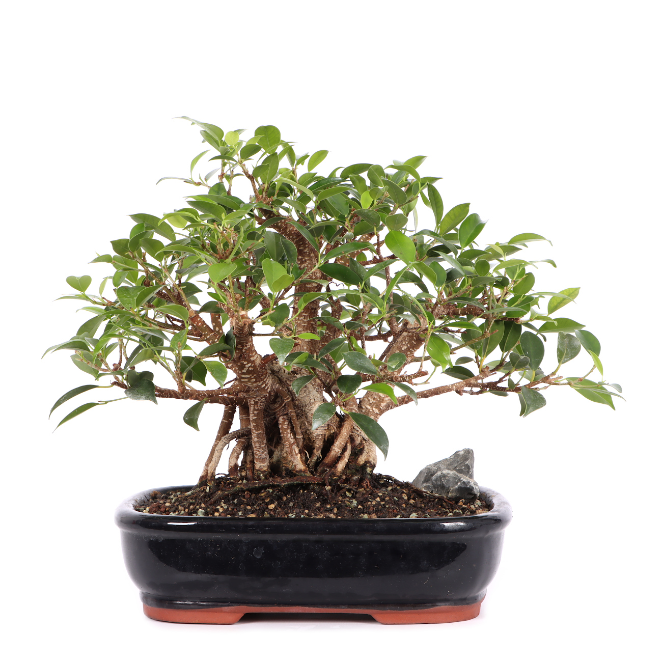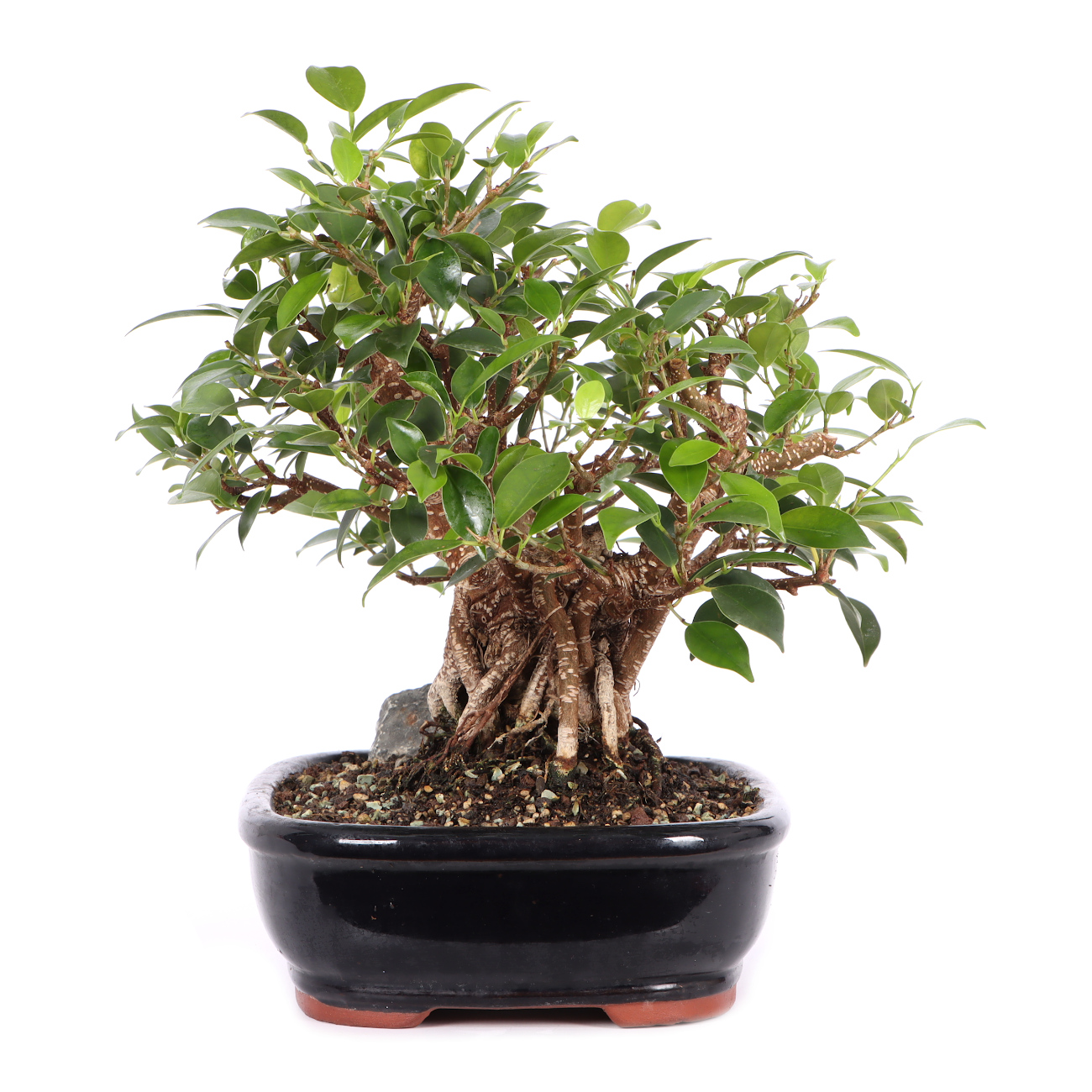 Die Sorte ‘Tiger Bark‘ hat im Vergleich zu der Art eine auffällige, tigerähnliche Rindenzeichnung. Diese weißen Kork- oder Lentizellen sowie die zahlreichen hellbraunen Luftwurzeln verleihen auch jungen Pflanzen schnell ein urwüchsiges Aussehen. Außerdem sind die Blätter dieser Ficus-Art klein und der Wuchs ist kompakt. Insgesamt hat diese Pflanze also sehr gute Eigenschaften als Bonsai.