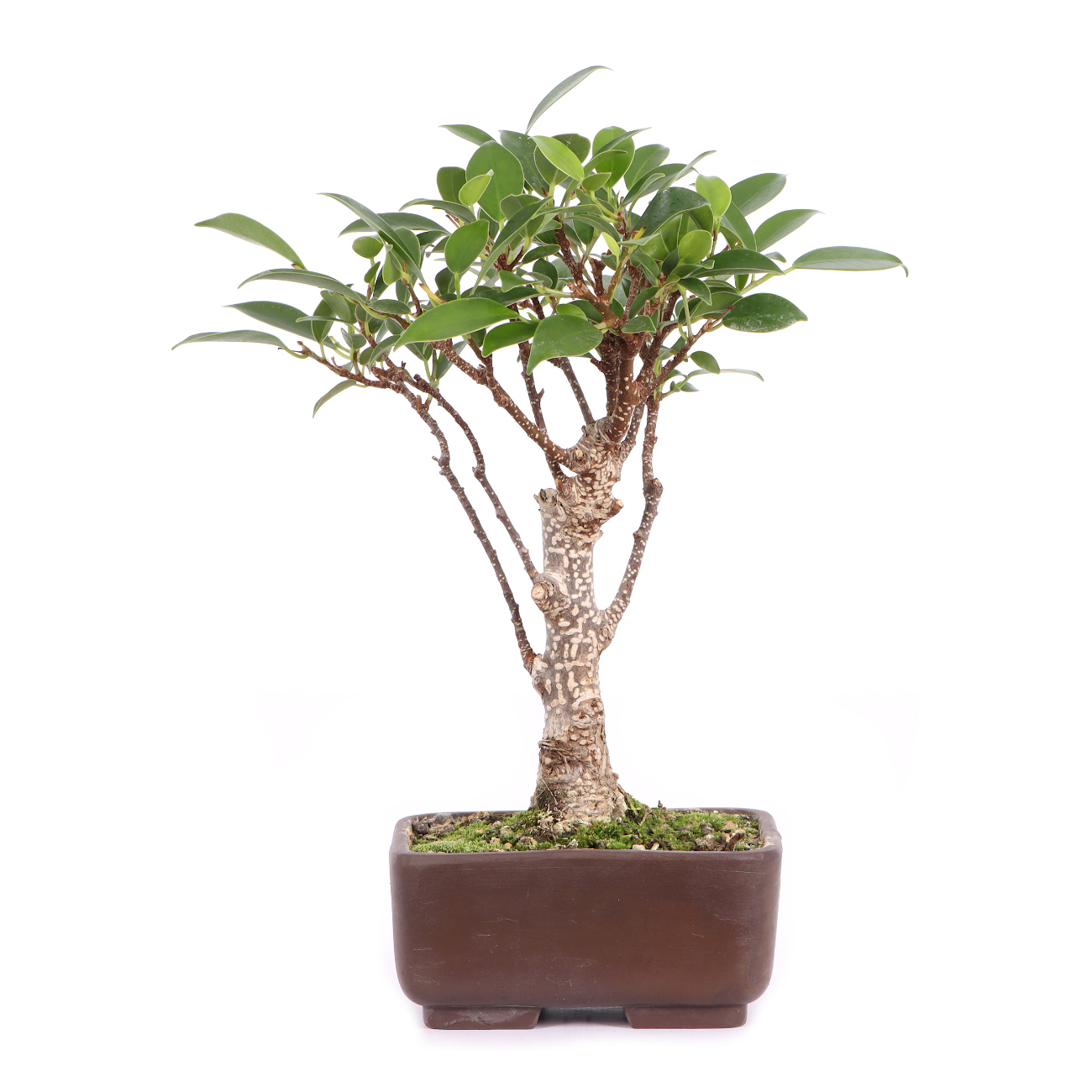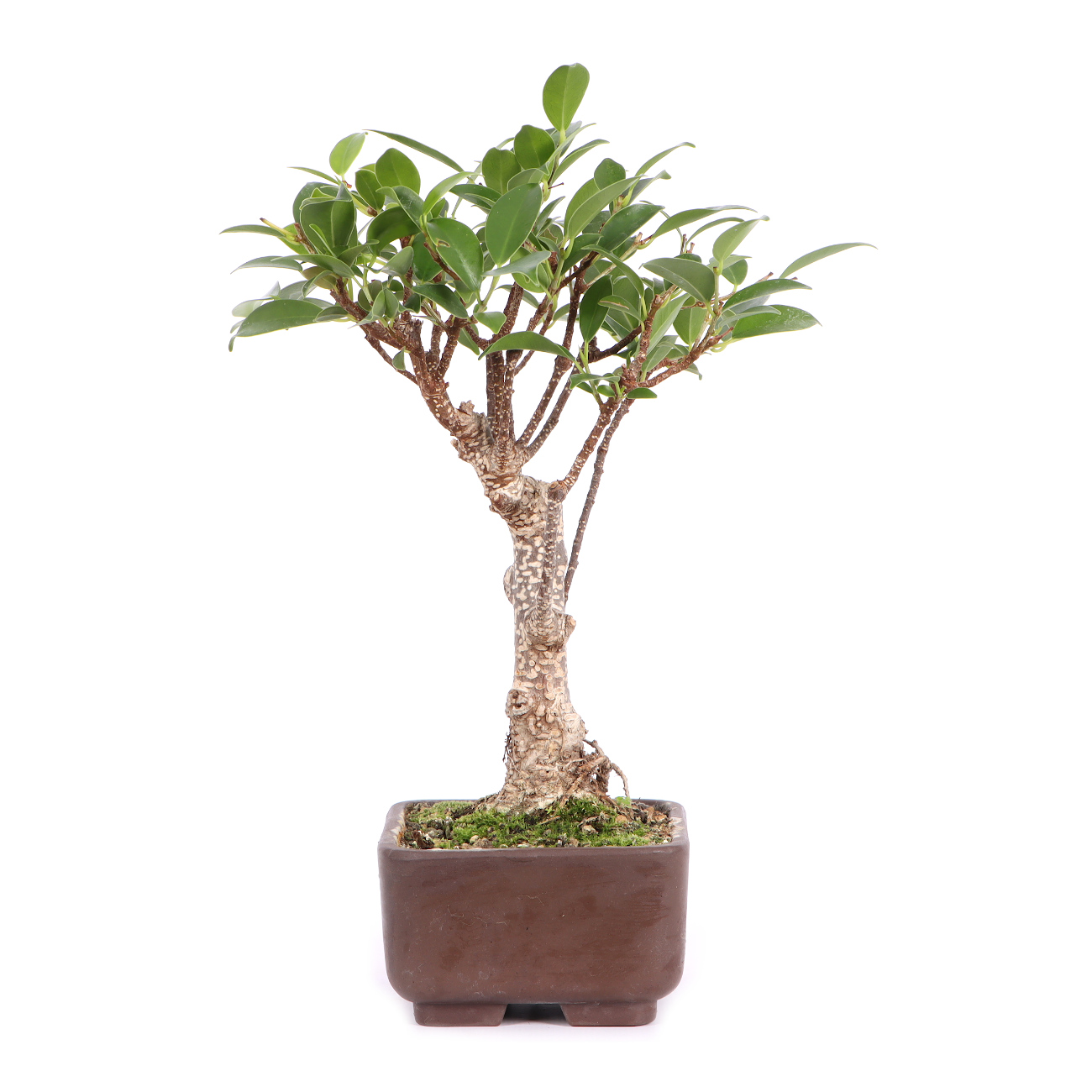 Die Sorte ‘Tiger Bark‘ hat im Vergleich zu der Art eine auffällige, tigerähnliche Rindenzeichnung. Diese weißen Kork- oder Lentizellen sowie die zahlreichen hellbraunen Luftwurzeln verleihen auch jungen Pflanzen schnell ein urwüchsiges Aussehen. Außerdem sind die Blätter dieser Ficus-Art klein und der Wuchs ist kompakt. Insgesamt hat diese Pflanze also sehr gute Eigenschaften als Bonsai.
