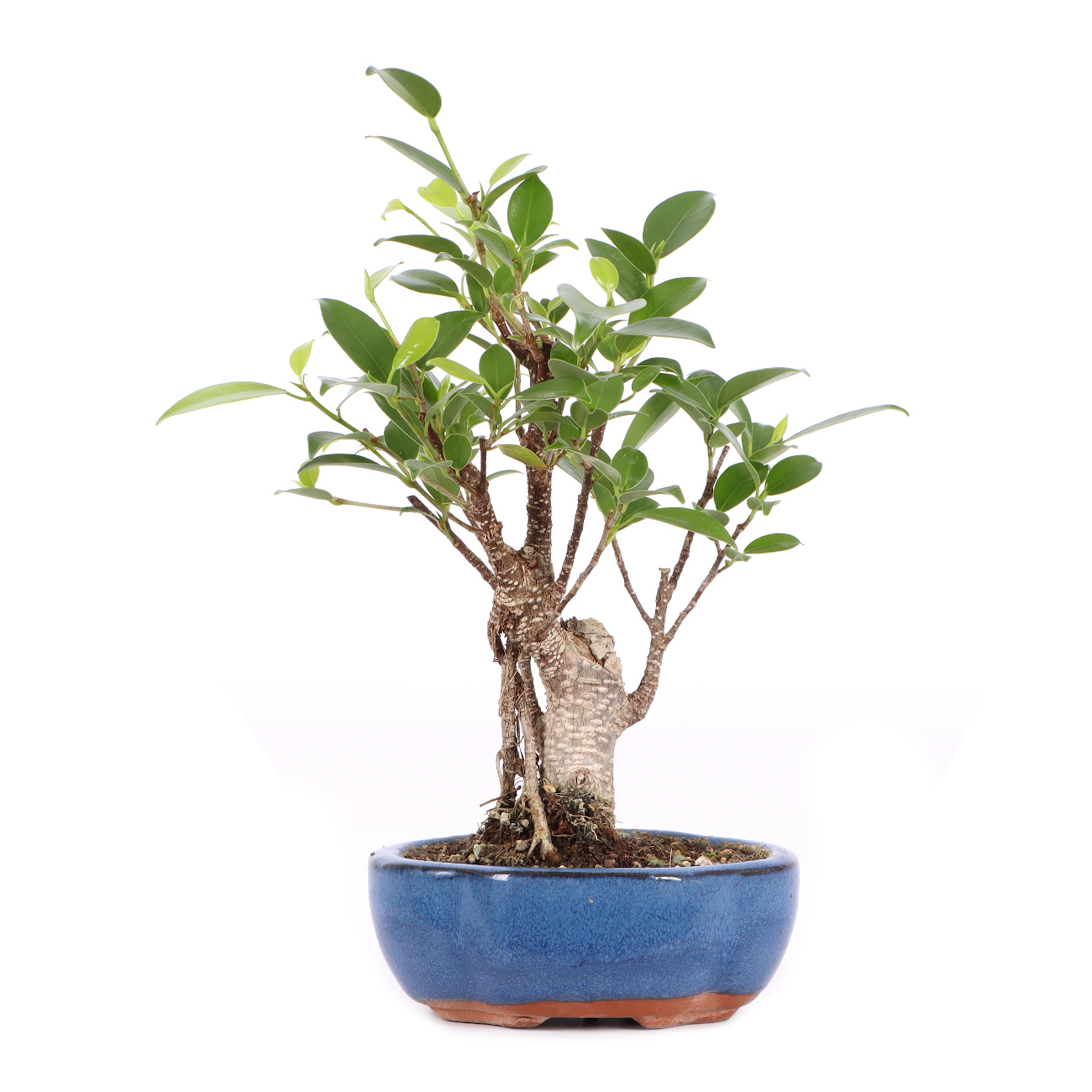 Die Sorte ‘Tiger Bark‘ hat im Vergleich zu der Art eine auffällige, tigerähnliche Rindenzeichnung. Diese weißen Kork- oder Lentizellen sowie die zahlreichen hellbraunen Luftwurzeln verleihen auch jungen Pflanzen schnell ein urwüchsiges Aussehen. Außerdem sind die Blätter dieser Ficus-Art klein und der Wuchs ist kompakt. Insgesamt hat diese Pflanze also sehr gute Eigenschaften als Bonsai.