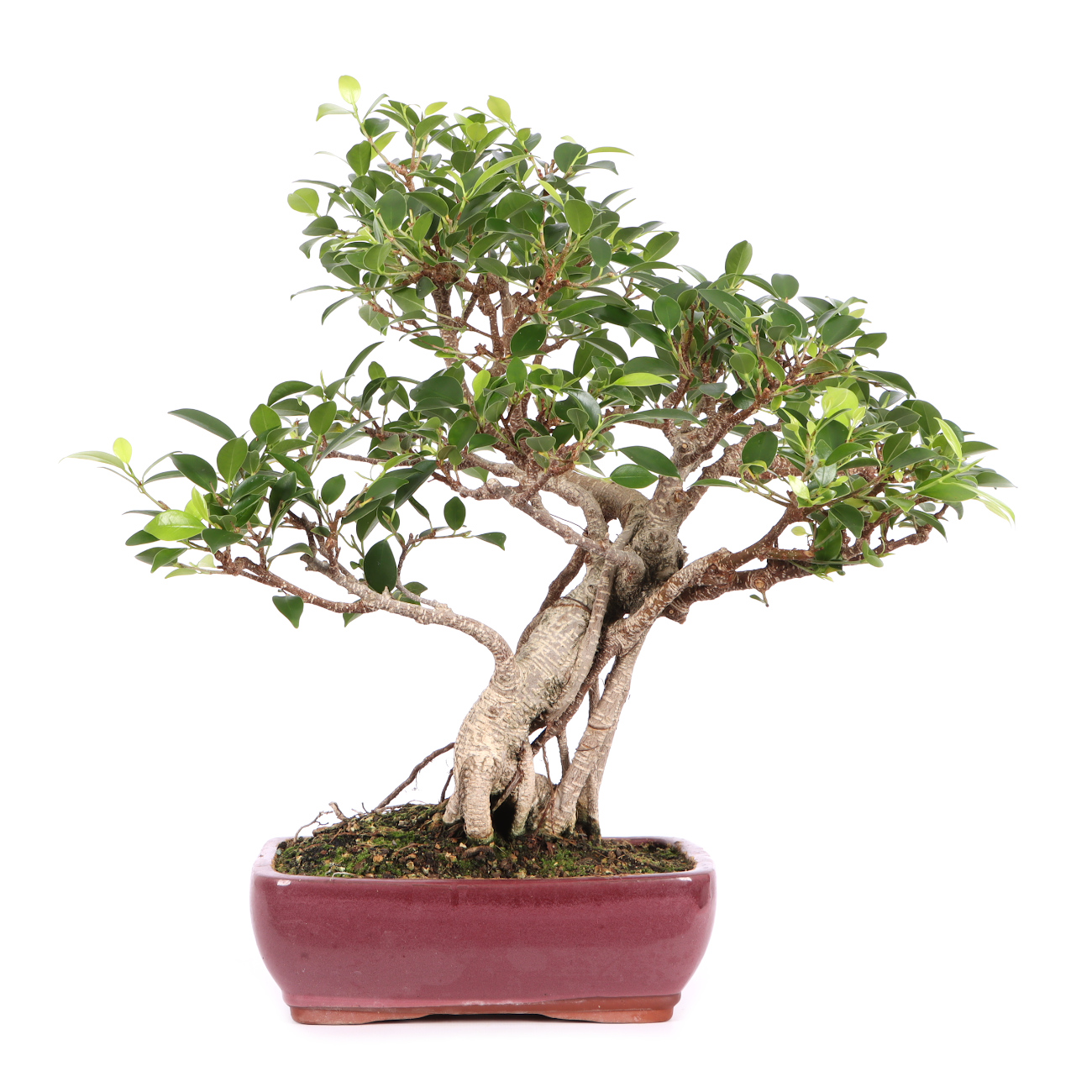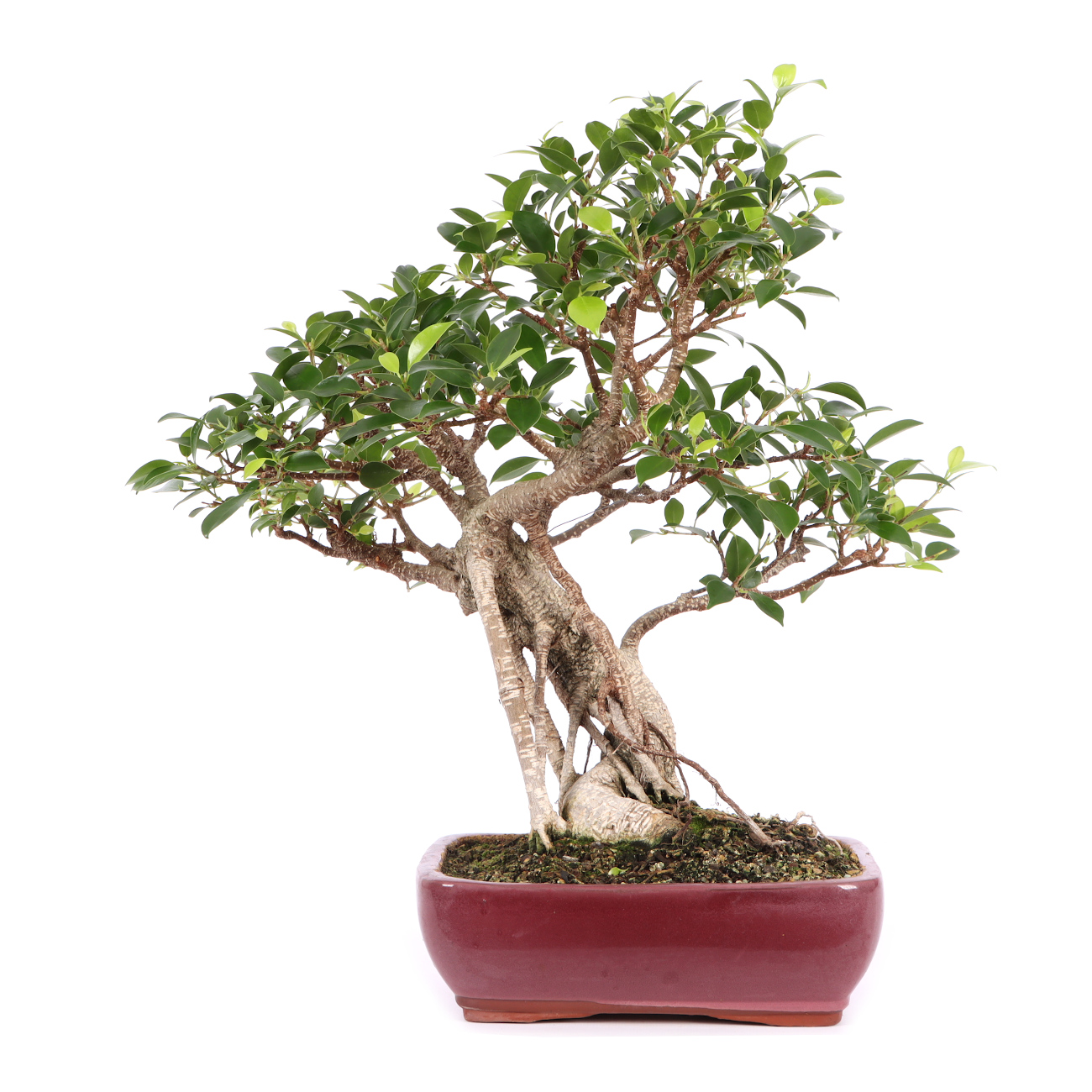 Die Sorte ‘Tiger Bark‘ hat im Vergleich zu der Art eine auffällige, tigerähnliche Rindenzeichnung. Diese weißen Kork- oder Lentizellen sowie die zahlreichen hellbraunen Luftwurzeln verleihen auch jungen Pflanzen schnell ein urwüchsiges Aussehen. Außerdem sind die Blätter dieser Ficus-Art klein und der Wuchs ist kompakt. Insgesamt hat diese Pflanze also sehr gute Eigenschaften als Bonsai.