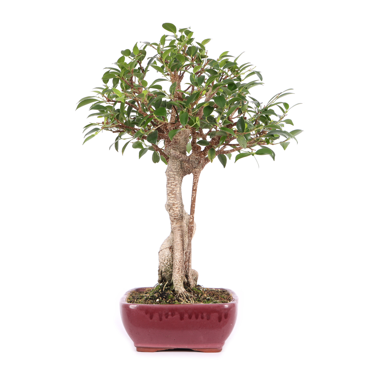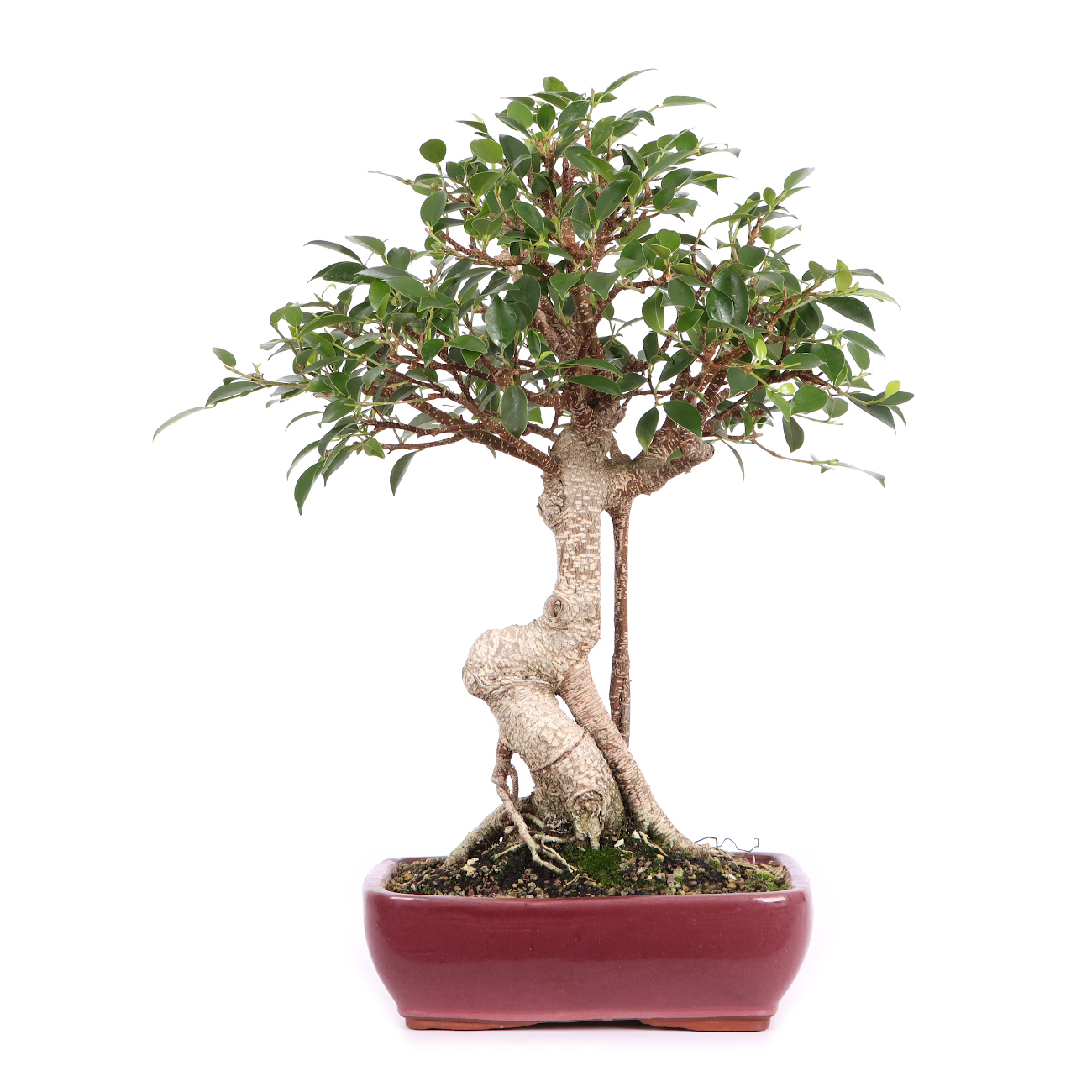 Die Sorte ‘Tiger Bark‘ hat im Vergleich zu der Art eine auffällige, tigerähnliche Rindenzeichnung. Diese weißen Kork- oder Lentizellen sowie die zahlreichen hellbraunen Luftwurzeln verleihen auch jungen Pflanzen schnell ein urwüchsiges Aussehen. Außerdem sind die Blätter dieser Ficus-Art klein und der Wuchs ist kompakt. Insgesamt hat diese Pflanze also sehr gute Eigenschaften als Bonsai.