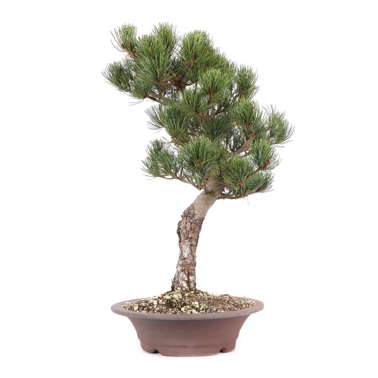 Die Mädchenkiefer hat in Japan aufgrund ihrer Symbolik (Männlichkeit, Stärke, langes Leben) einen sehr hohen Stellenwert und ist vielleicht der beliebteste Bonsai überhaupt. Sie ist robust und bietet viele gestalterische Möglichkeiten. Als Bonsai strahlen sie durch ihren derben Charakter viel Kraft aus. Andererseits zeigt die gestaltete Kiefer im Vergleich zu Laubbäumen wenig Veränderung und vermittelt dem Betrachter dadurch im Jahresverlauf viel Ruhe. Eine gestaltete Kiefer ist im Grunde sehr pflegeleicht. Die neuen Triebe (Kerzen) werden im Mai eingekürzt bzw. mit den Fingern gebrochen und zu dichte Astpartien werden im Spätsommer ausgelichtet. Im Sommer ist ein sonniger Standort sehr von Vorteil. Kiefern sollten nicht zu nass gehalten werden. Bei langen Regenperioden empfiehlt es sich die Pflanze sogar unter ein Dach zu stellen. Drahten und Gestalten kann man das ganze Jahr über. Dies sollte aber nicht mit dem Umtopfen Anfang September zusammen fallen. Außerdem muss die Pflanze nach der Gestaltung am besten frostfrei stehen. Bei dem Substrat verwendet man eine strukturstabile, luftige Mischung und achtet auf das Vorhandensein von Mykorrhiza-Pilzen. Man erkennt den Pilz an einem gleichmäßigen, feinen und weißen Belag, der die Wurzeln umhüllt und im Optimalfall die ganze Erde durchzieht. Kiefern sind sehr frosthart. Trotzdem sollten sie im Winter vor trockenen Winden geschützt werden. Bonsai-Sämlinge von der Mädchenkiefer haben sich in Mitteleuropa nicht bewährt bzw. gehen nach gewisser Zeit meistens ein. Wir bieten ausschließlich Veredelungen an, da die Wurzeln der Unterlage (z.B. Pinus thunbergii) besser an unser Klima angepasst sind.