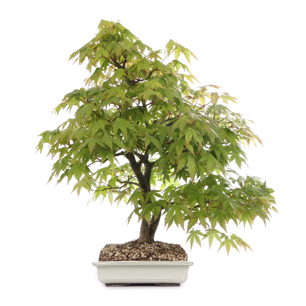 Der Fächer-Ahorn ist wohl der bekannteste asiatische Laubbaum für die Bonsaigestaltung. Die filigrane Verzweigung mit den zarten Blättern verleiht dem Bonsai oft ein sehr anmutiges und graziles Erscheinungsbild. Auch die leuchtende Herbstfärbung ist eine Bereicherung für jede Bonsaisammlung. Für alle Fächer-Ahorne ist ein heller Standort im Freien wichtig. Je heller die Pflanzen stehen, umso kräftiger ist die Blattfärbung. Nur an extrem trockenen und heißen Sommertagen müssen sie schattiert werden. Der Ahorn verträgt keinen verdichteten, schlecht belüfteten und staunassen Boden. Hier kommt es schnell zu Wurzel- bzw. Pilzerkrankungen. Die Erde sollte aber auch besonders im Sommer nicht austrocknen. Also verwendet man am besten ein lockeres Substrat und führt einen regelmäßigen Wurzelschnitt und ein Umtopfen in frisches Substrat im Frühjahr durch. Wenn möglich, benutzt man Regenwasser oder weiches Leitungswasser zum Gießen. Hartes Wasser unbedingt vermeiden. Gedüngt wird in der Wachstumszeit von Mai bis Oktober. Nach unseren Erfahrungen ist ein Formschnitt im Juni, verbunden mit einem Blattschnitt, ideal. Dadurch vermeidet man das „Ausbluten“ von Ästen, die Wunden verheilen sehr schnell und der Neuaustrieb ist nicht zu stark. Die neu gebildeten Blätter sind außerdem kleiner und kräftiger gefärbt. Wunden sollten direkt mit einem Wundverschlussmittel behandelt werden, um das Eindringen von Krankheitserregern zu verhindern. Im Winter ist ein guter Frostschutz sinnvoll.