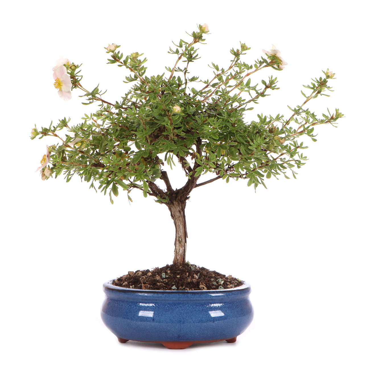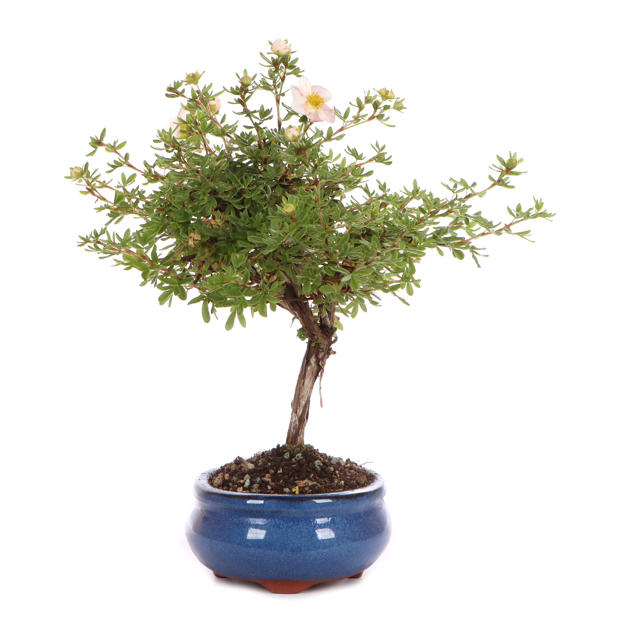 Der Fingerstrauch hat optimale Eigenschaften um ganz besondere Bonsais zu gestalten. Die Blätter sind klein und filigran und verfärben sich gelborange im Herbst. Die Pflanze ist sehr schnittverträglich und bildet viele zum Teil sehr feine Äste. Die Rinde ist rotbraun und löst sich in dünnen Streifen, ähnlich wie bei einem Wacholder. Nicht zuletzt blüht der Fingerstrauch unermüdlich und mehrmals im Jahr. Insgesamt ist die Pflanze auch sehr robust und verzeiht den einen oder anderen Pflegefehler. Der Fingerstrauch sollte für eine optimale Blüte sonnig stehen. An sehr heißen Tagen muss man jedoch auf eine ausreichende Bewässerung achten oder die Pflanze etwas geschützt stellen. Das Wurzelwachstum ist stark und die Pflanzen müssen regelmäßig umgetopft werden.