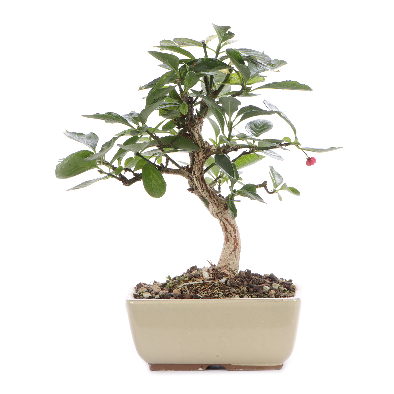 Das Besondere an dem Pfaffenhütchen ist sein Fruchtschmuck. Dieser ist sehr zierend und haftet ab August sehr lange an den Pflanzen. Auch die bunte Herbstfärbung mit einer Mischung aus zarten bis leuchtenden Gelb- und Rottönen ist sehr schön. Die jungen Triebe sind grün mit leichten Korkleisten und der Stamm ist glatt und im Alter teilweise fast weiß. Leider verzweigt sich das Pfaffenhütchen von alleine ungern. Es muss daher konsequent zurückgeschnitten werden. Das Drahten sollte ebenfalls rechtzeitig geschehen, da ältere Triebe sehr hart werden und sich dann nicht mehr biegen lassen. Die Durchwurzelung ist intensiv und man sollte die Pflanzen regelmäßig umtopfen. Im Frühjahr wird das Pfaffenhütchen sehr häufig von der Gespinnstmotte befallen. Entsprechende Gespinste, in denen sich die blattfressenden Raupen befinden, kann man einfach mit der Hand entfernen.