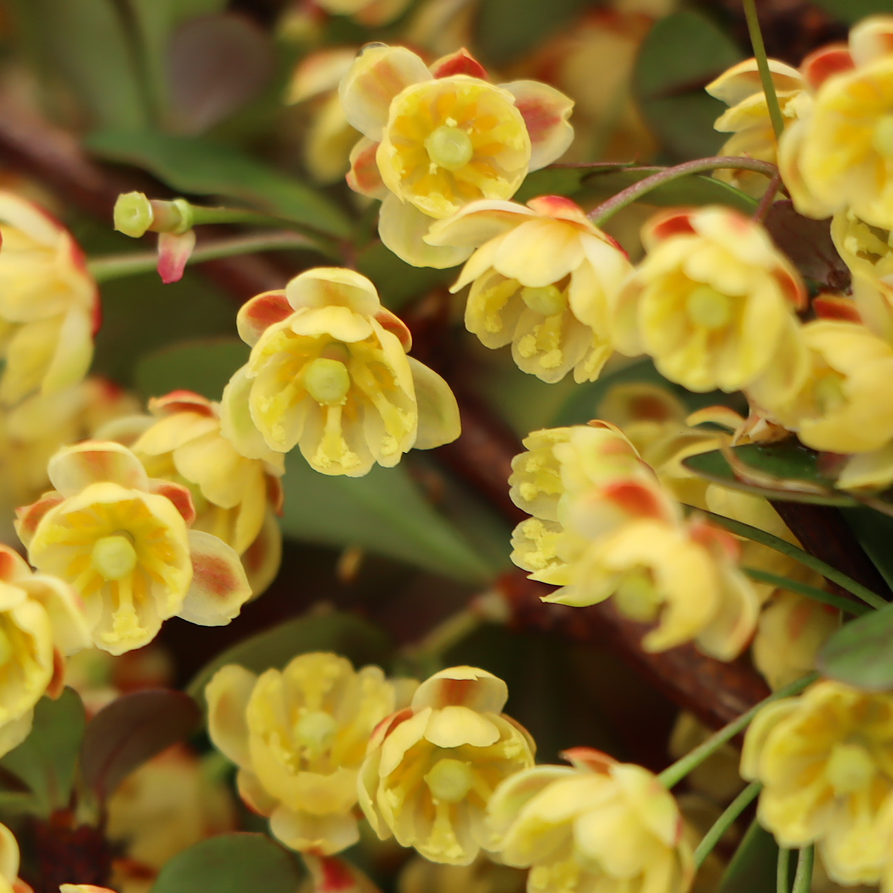 Aus der Thunberg-Berberitze wurden viele Sorten und Hybriden gezüchtet. So auch die Sorte ‘Atropurpurea Nana‘. Diese klein- und rotblättrige Pflanze besticht durch ihre ganzjährig, dunkelrot gefärbten Blätter. Im Herbst verfärben sich die Blätter dann leuchtend scharlachrot. Je sonniger der Standort im Sommer ist, umso intensiver ist auch die Rotfärbung der Blätter. Schattige Standorte führen zu einer grünroten Verfärbung des Laubes. Auch diese kleinwüchsige Sorte blüht mit kleinen gelben Blüten. Diese sitzen an besonderen Kurztrieben am zweijährigen Holz. Die Rinde wird mit zunehmendem Alter sehr borkig und verleiht dem Baum einen besonderen Ausdruck von Reife.