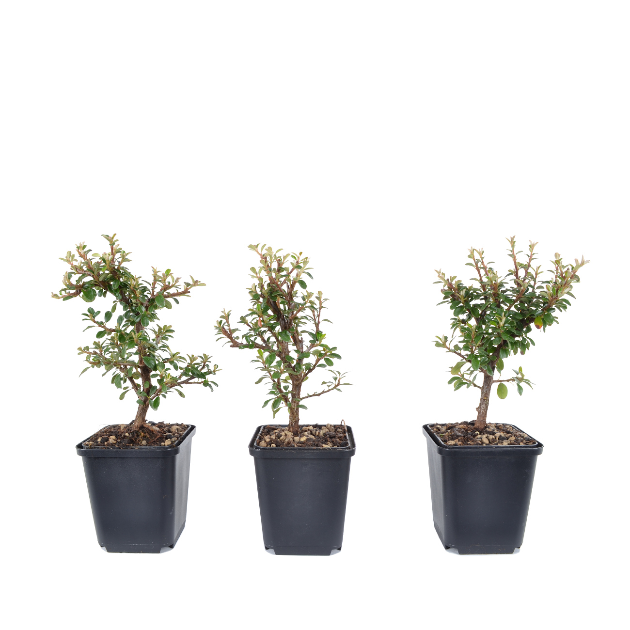 Die Zwergmispel ist wie für die Bonsaigestaltung geschaffen. Ihre Blätter, Blüten und Früchte sind klein, absolut schnittverträglich und treiben immer wieder willig aus. Sie blüht von Mai bis Juni mit kleinen weißen Blüten und bekommt anschließend ab September rote Beeren. Diese haften auch noch im Winter an der Pflanze. Sie ist für alle Gestaltungsformen geeignet, zumal sie das ganze Jahr gedrahtet und geschnitten werden kann. Sie kann über viele Jahre hin sehr klein gehalten werden. Die Zwergmispel eignet sich auch als Unterbepflanzung für Wälder oder Landschaften (Saikei). Beim Drahten sollte darauf geachtet werden, dass die kleinen Blätter nicht mit eingedrahtet werden. Dies ist bei der Vielzahl an Blättern natürlich nicht ganz einfach. Die Zwergmispel stellt keine besonderen Standortansprüche, jedoch sollte man Extreme vermeiden. Je heller der Standort ist, umso ausgeprägter ist die Blüten- und Fruchtbildung.