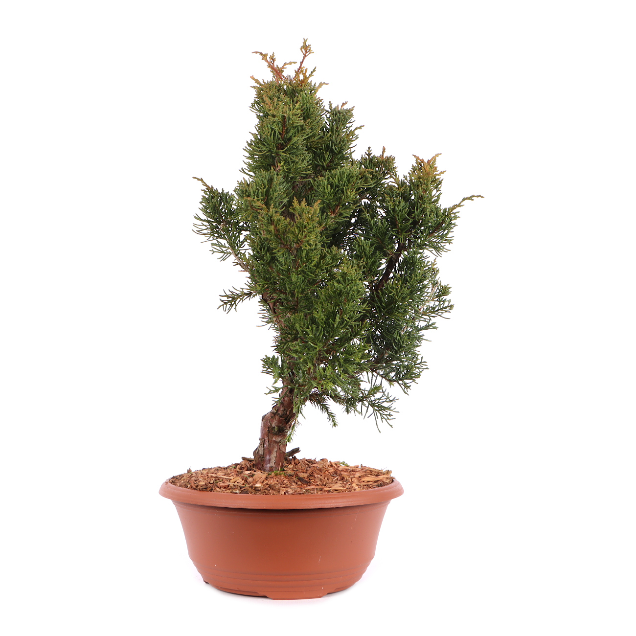 Der Chinesische Wacholder ist neben der Mädchenkiefer das bekannteste und beliebteste Nadelgehölz für die Bonsaigestaltung. Das feine immergrüne Laub, die Biegsamkeit des Holzes und die allgemeine Robustheit, machen die Pflanzen zu einem optimalen Ausgangsmaterial für die Bonsaigestaltung. In Japan findet man außerdem uralte und bizarr gewachsene Wacholder in der Natur. Durch die genannten Eigenschaften bieten sich fast unbegrenzte Möglichkeiten, das Grün der Pflanze neu anzuordnen und interessante Totholzpartien zu gestalten. Der Wacholder verzeiht hier auch massive Eingriffe, solange man ihm immer wieder Zeit zur Regeneration gibt. Ein sonniger Platz im Freien ist im Sommer für eine gesunde Entwicklung sehr wichtig. Bei einem schattigen Standort leidet die Ausfärbung der Nadeln, und die Triebe werden lang und unansehnlich. Auch im Winter ist ein sehr heller aber geschützter Platz unerlässlich. Die rötlich-braune Verfärbung der Nadeln im Winter ist normal. Im Frühjahr, wenn es wärmer wird, werden die Nadeln wieder grün. Auch wenn in den Sommermonaten reichliches Gießen erforderlich ist, muss Staunässe unbedingt vermieden werden. Kurzfristige Trockenheit verträgt der Chinesische Wacholder ohne Schaden. Die Gestaltung mit Formschnitt und Drahten wird in der Wachstumsruhe von November bis März vorgenommen. Umgetopft wird von August bis September in gut luft- und wasserdurchlässige Erde. An tierischen Schädlingen sind bei uns an Wacholdern nur Blattläuse und Spinnmilben aufgetreten. Mit handelsüblichen Pflanzenschutzmitteln sind diese aber schnell zu beseitigen. Ein optimaler Standort, aufmerksame Pflege und eine ausreichende Ernährung sind in der Regel die besten vorbeugenden Pflanzenschutzmaßnahmen.