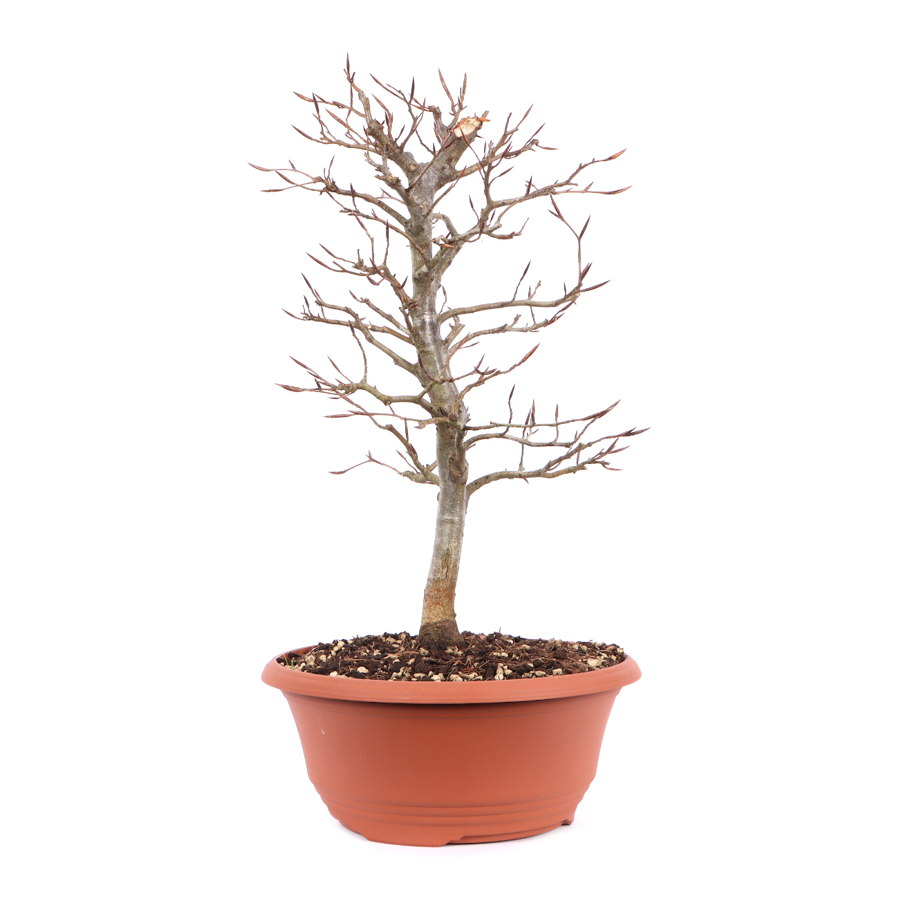 Der Buchenwald sollte jedem Bonsai-Liebhaber vertraut sein. Er ist ein Synonym für die Natur in Deutschland. Entsprechend ist die Beziehung zu der Rotbuche über die Pflege eines Bonsais mehr als verständlich. Die Buche verträgt den Rückschnitt sehr gut und treibt willig auch aus dem alten Holz wieder aus. Bei vitalen und reifen Pflanzen kann der frische Austrieb pinziert werden. Hierbei wird die noch weiche Triebspitze bis auf zwei neue Blätter abgezupft. Dadurch entsteht eine Stauchung und die Internodien des neuen Triebes bleiben kürzer. Äste können gut gedrahtet werden aber der Draht muss unbedingt rechtzeitig entfernt werden. Ansonsten entstehen unansehnliche Narben, die aufgrund der glatten Rinde nicht mehr verschwinden. Die Rotbuche liebt einen sonnigen Platz aber gedeiht auch im Halbschatten. Bei zu großer Hitze und Trockenheit sollte man die Pflanze geschützt stellen. Das Substrat sollte nicht austrocknen, aber Staunässe ist ebenfalls zu vermeiden. Eine Behandlung mit Mykorrhiza und eine organische Düngung sind für den Boden und die Vitalität der Pflanze sehr von Vorteil. Die Buche ist winterhart, aber im Frühjahr spätfrostgefährdet. Nachdem sich die Blätter entfaltet haben, sollte man außerdem auf Wollläuse achten und diese rechtzeitig mit Wasser abspülen.