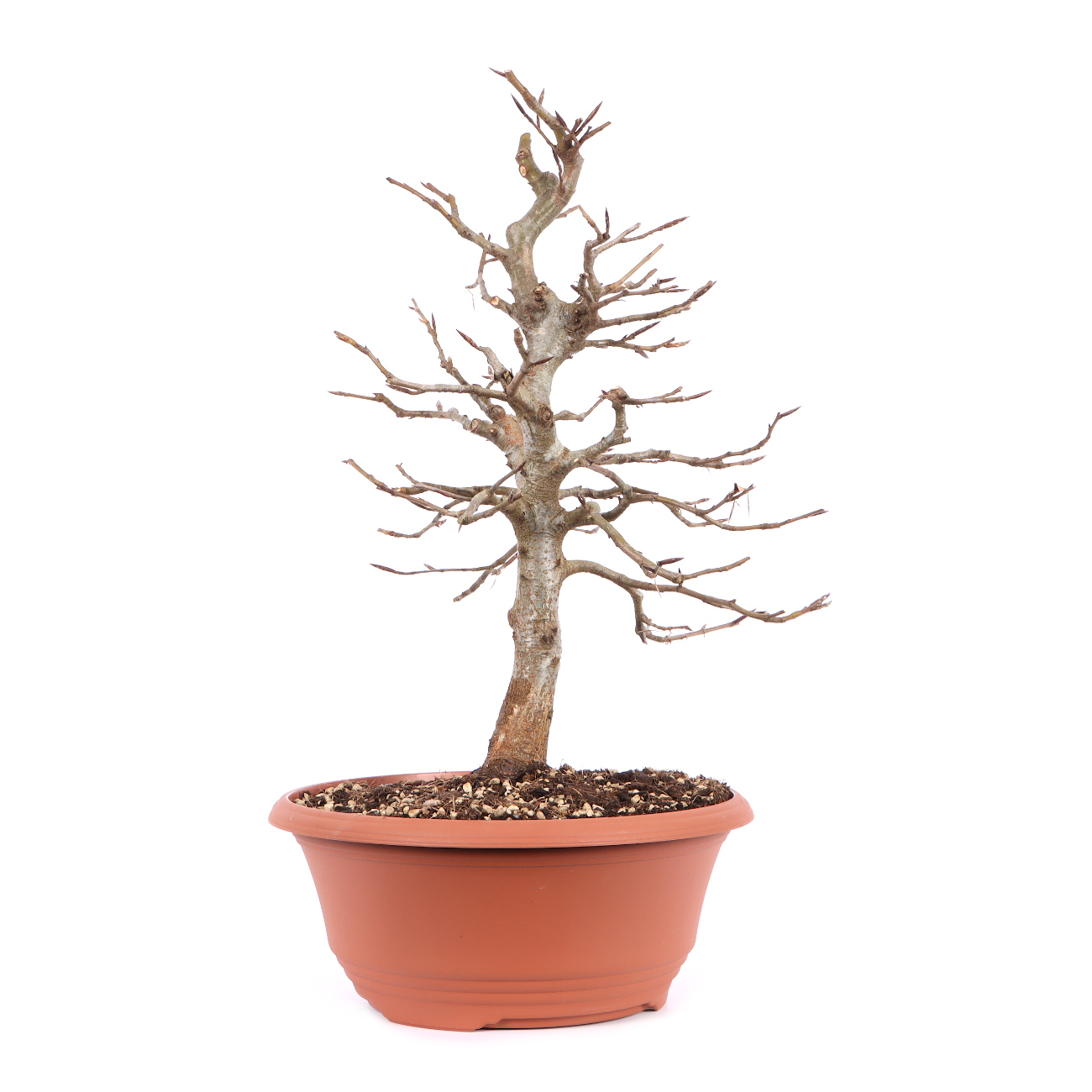 Der Buchenwald sollte jedem Bonsai-Liebhaber vertraut sein. Er ist ein Synonym für die Natur in Deutschland. Entsprechend ist die Beziehung zu der Rotbuche über die Pflege eines Bonsais mehr als verständlich. Die Buche verträgt den Rückschnitt sehr gut und treibt willig auch aus dem alten Holz wieder aus. Bei vitalen und reifen Pflanzen kann der frische Austrieb pinziert werden. Hierbei wird die noch weiche Triebspitze bis auf zwei neue Blätter abgezupft. Dadurch entsteht eine Stauchung und die Internodien des neuen Triebes bleiben kürzer. Äste können gut gedrahtet werden aber der Draht muss unbedingt rechtzeitig entfernt werden. Ansonsten entstehen unansehnliche Narben, die aufgrund der glatten Rinde nicht mehr verschwinden. Die Rotbuche liebt einen sonnigen Platz aber gedeiht auch im Halbschatten. Bei zu großer Hitze und Trockenheit sollte man die Pflanze geschützt stellen. Das Substrat sollte nicht austrocknen, aber Staunässe ist ebenfalls zu vermeiden. Eine Behandlung mit Mykorrhiza und eine organische Düngung sind für den Boden und die Vitalität der Pflanze sehr von Vorteil. Die Buche ist winterhart, aber im Frühjahr spätfrostgefährdet. Nachdem sich die Blätter entfaltet haben, sollte man außerdem auf Wollläuse achten und diese rechtzeitig mit Wasser abspülen.