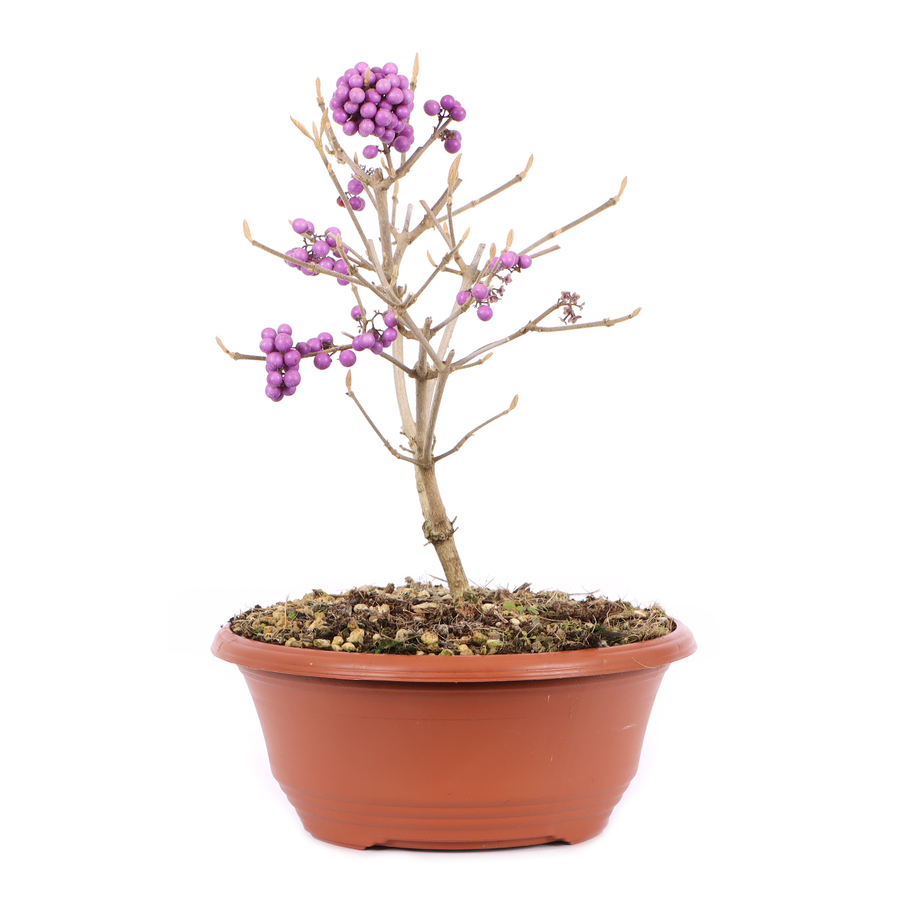 Das Einzigartige an dieser Pflanze sind die violetten Früchte, die an einem Bonsai natürlich besonders zur Geltung kommen. Steht in der Gartenbepflanzung eine weitere Schönfrucht, ist die Fruchtbildung übrigens stärker. Ansonsten hat die Pflanze auch eine sehr schöne, gelborange Herbstfärbung und auch die Blüte ist auffällig und gerne von Insekten besucht. Auch als Bonsai wächst die Schönfrucht etwas sparrig und erfordert einen entsprechenden Rückschnitt und evtl. das Drahten von einzelnen Ästen. Man kann aber auch einzelne Individuen als Gruppe zusammenpflanzen und erhält dadurch eine sehr gefällige Gestalt mit guter Verzweigung. Umgetopft wird im Frühjahr vor dem Austrieb der Blätter. Die Wurzeln der Schönfrucht sollten vor zu viel Frost geschützt werden!