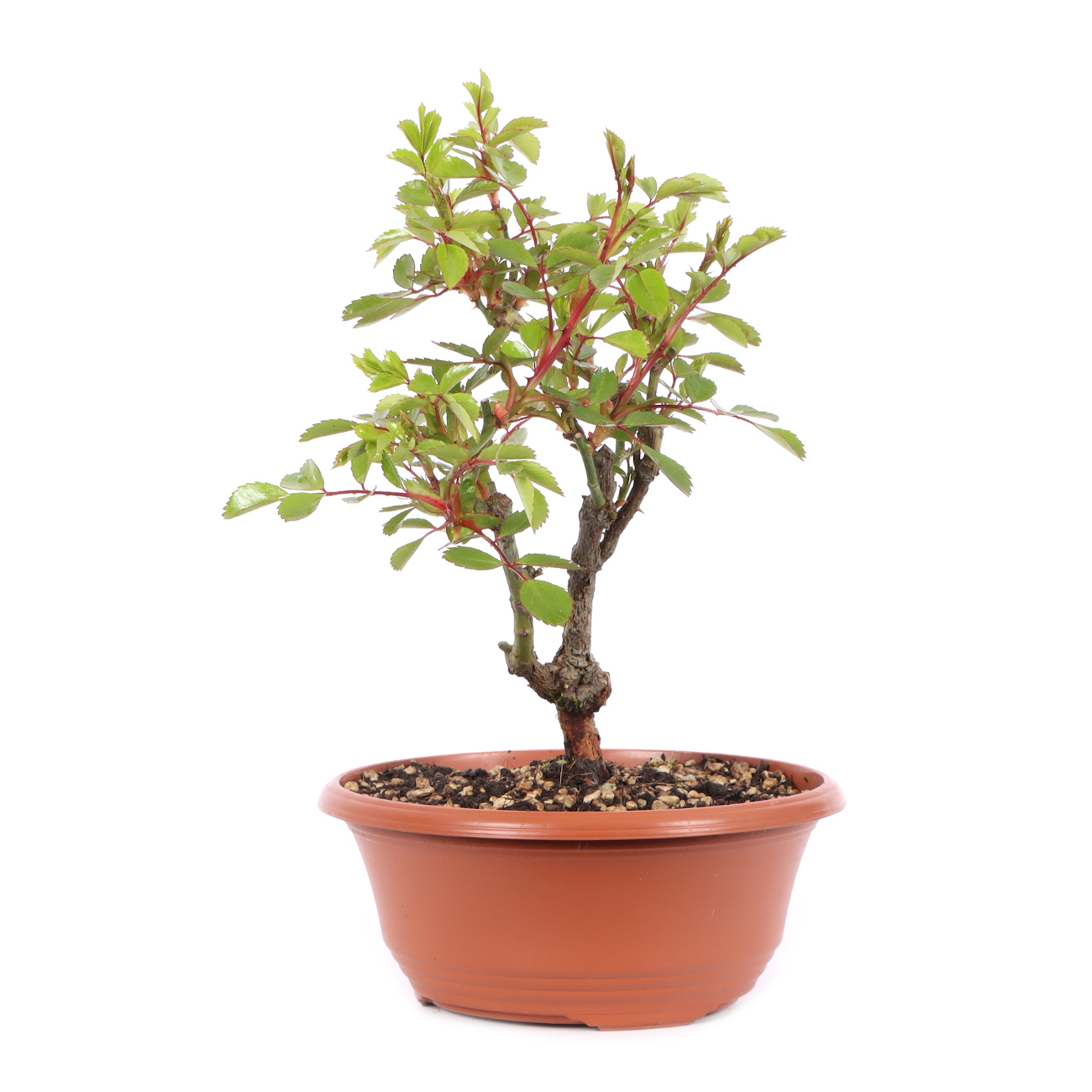 Rosen sind besonders in europäischen Ziergärten zu finden und sind den Deutschen vielleicht so lieb, wie die Azaleen und Zierkirschen den Japanern. Aber auch in Japan finden sich Rosen-Bonsais. Die Pflanzen entwickeln einen derben, grobrissigen Stamm und eine leichte Krone. Die dünnen langen Triebe halten zarte Blättchen und schöne duftende Blüten. Im Herbst und Winter zieren dann Hagebutten die Pflanze. Da sich die Blüten am einjährigen Holz entwickeln, ist ein üblicher Erhaltungsschnitt nicht sinnvoll. In Japan sieht man auch häufig Rosen, dessen Triebe lang durchtreiben und blühen dürfen. Stellt man die Pflanze dann auf einen hohen Kaskadentisch, wirken sie besonders schön. Nach der Blüte kann zurückgeschnitten werden. Dann bildet sich meistens noch ein weiterer Trieb mit Blüte. Spätestens im Frühjahr sollte man die Rosen kräftig einkürzen, damit sie nicht aus der Form wachsen. Triebe, die am Wurzelansatz austreiben, sind in jedem Fall zu entfernen. Rosen bevorzugen einen sonnigen und luftigen Standort. Im Winter ist ein normaler Schutz gegen trockene Winde ausreichend.