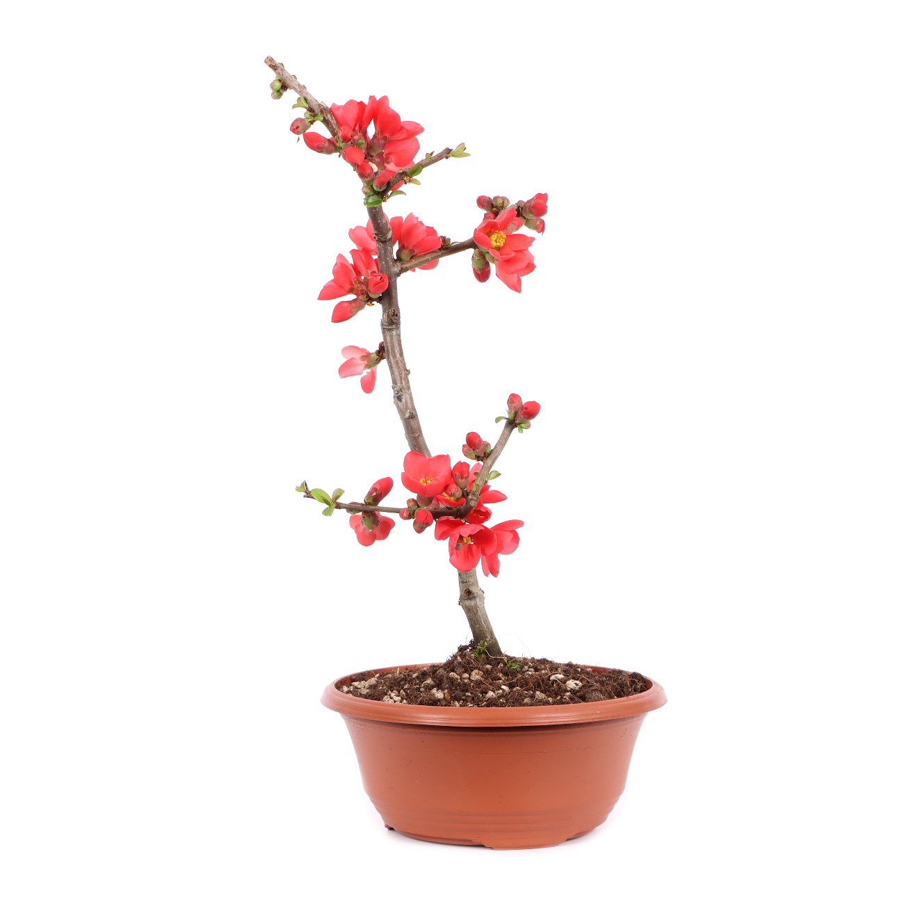 Als Bonsai erfreuen die Zierquitten besonders durch ihre Blütenpracht im Frühjahr. Es kommt oft vor, dass die Quitte schon im Januar mit den ersten Blüten Farbe in den Winter bringt. Die Hauptblütezeit ist aber im März und April vor dem Blattaustrieb. Auch die gelben Steinfrüchte sind an den Bonsai sehr dekorativ und bilden sich schon bei jungen Exemplaren. Die Blütenbildung findet am zwei- und dreijährigem Holz statt. Daher können die für die Bonsaigestaltung so wichtigen frischen Triebe im Sommer zurückgeschnitten werden, ohne dass das Einfluss auf die Blüten- und Fruchtbildung hat. Um die Blüte und den nahtlos darin übergehenden Frühjahrsaustrieb nicht zu stören, ist es aber ratsam den Formschnitt und das Umtopfen in den Spätherbst zu verlegen. Ein guter Überwinterungsschutz ist dann unbedingt erforderlich. Bei extremer Hitze empfiehlt es sich die Pflanze etwas schattiger zu stellen, um Blattverbrennungen zu vermeiden.