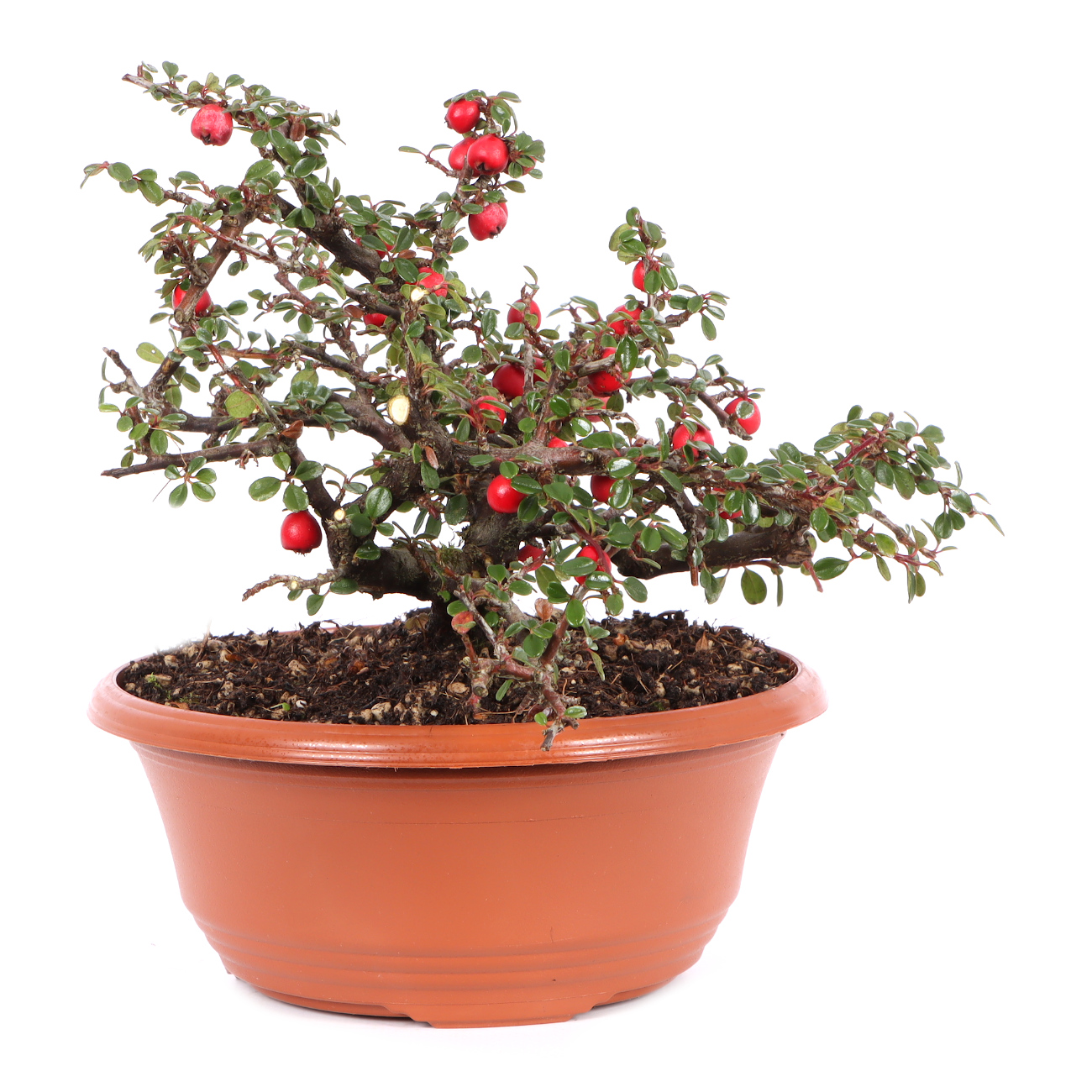 Die Zwergmispel ist wie für die Bonsaigestaltung geschaffen. Ihre Blätter, Blüten und Früchte sind klein, absolut schnittverträglich und treiben immer wieder willig aus. Sie blüht von Mai bis Juni mit kleinen weißen Blüten und bekommt anschließend ab September rote Beeren. Diese haften auch noch im Winter an der Pflanze. Sie ist für alle Gestaltungsformen geeignet, zumal sie das ganze Jahr gedrahtet und geschnitten werden können. Sie kann über viele Jahre hin sehr klein gehalten werden. Die Zwergmispel eignet sich auch als Unterbepflanzung für Wälder oder Landschaften (Saikei). Beim Drahten sollte darauf geachtet werden, dass die kleinen Blätter nicht mit eingedrahtet werden. Dies ist bei der Vielzahl an Blättern natürlich nicht ganz einfach. Die Zwergmispel stellt keine besonderen Standortansprüche, aber man sollte Extreme trotzdem vermeiden. Je heller der Standort ist, umso ausgeprägter ist die Blüten- und Fruchtbildung.