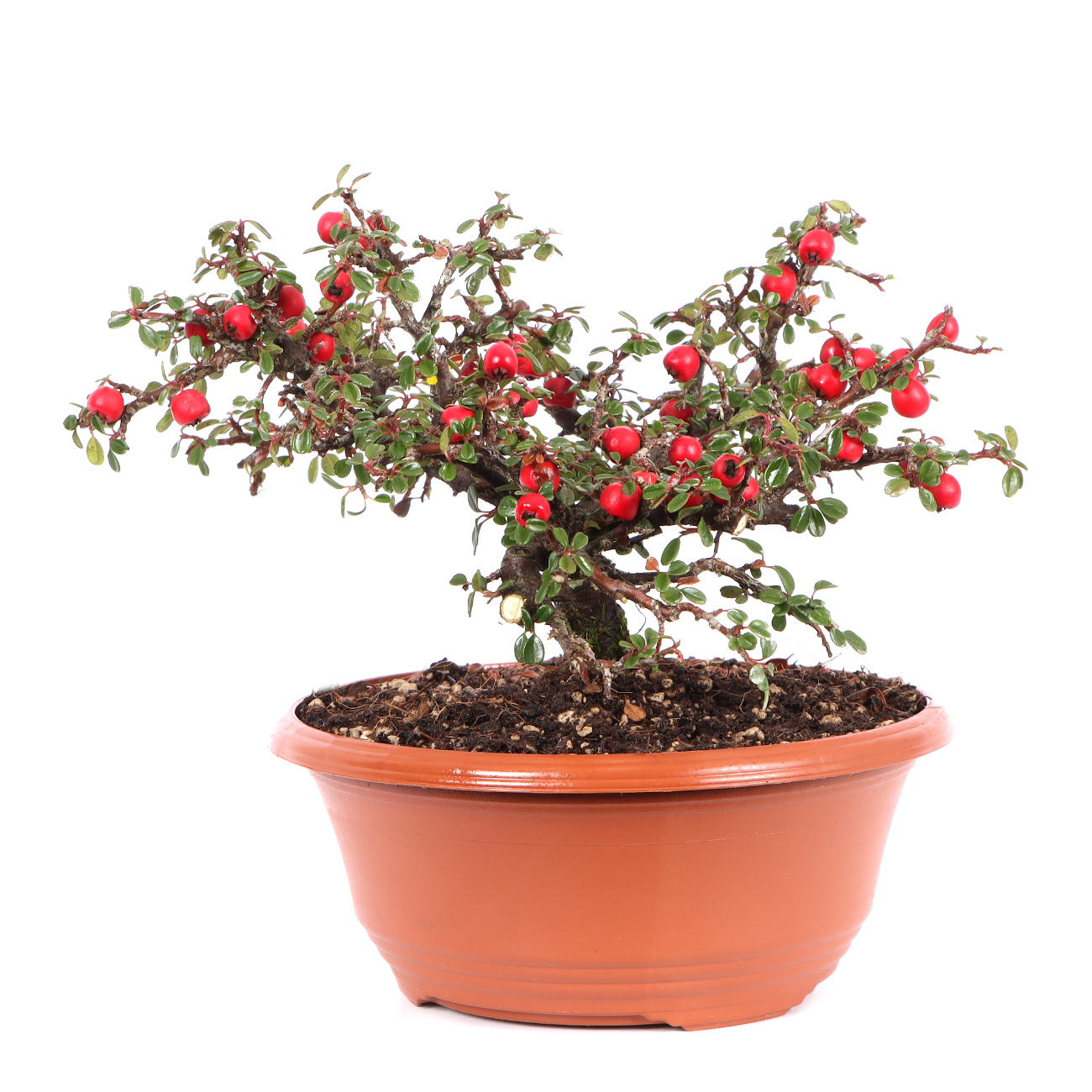 Die Zwergmispel ist wie für die Bonsaigestaltung geschaffen. Ihre Blätter, Blüten und Früchte sind klein, absolut schnittverträglich und treiben immer wieder willig aus. Sie blüht von Mai bis Juni mit kleinen weißen Blüten und bekommt anschließend ab September rote Beeren. Diese haften auch noch im Winter an der Pflanze. Sie ist für alle Gestaltungsformen geeignet, zumal sie das ganze Jahr gedrahtet und geschnitten werden können. Sie kann über viele Jahre hin sehr klein gehalten werden. Die Zwergmispel eignet sich auch als Unterbepflanzung für Wälder oder Landschaften (Saikei). Beim Drahten sollte darauf geachtet werden, dass die kleinen Blätter nicht mit eingedrahtet werden. Dies ist bei der Vielzahl an Blättern natürlich nicht ganz einfach. Die Zwergmispel stellt keine besonderen Standortansprüche, aber man sollte Extreme trotzdem vermeiden. Je heller der Standort ist, umso ausgeprägter ist die Blüten- und Fruchtbildung.
