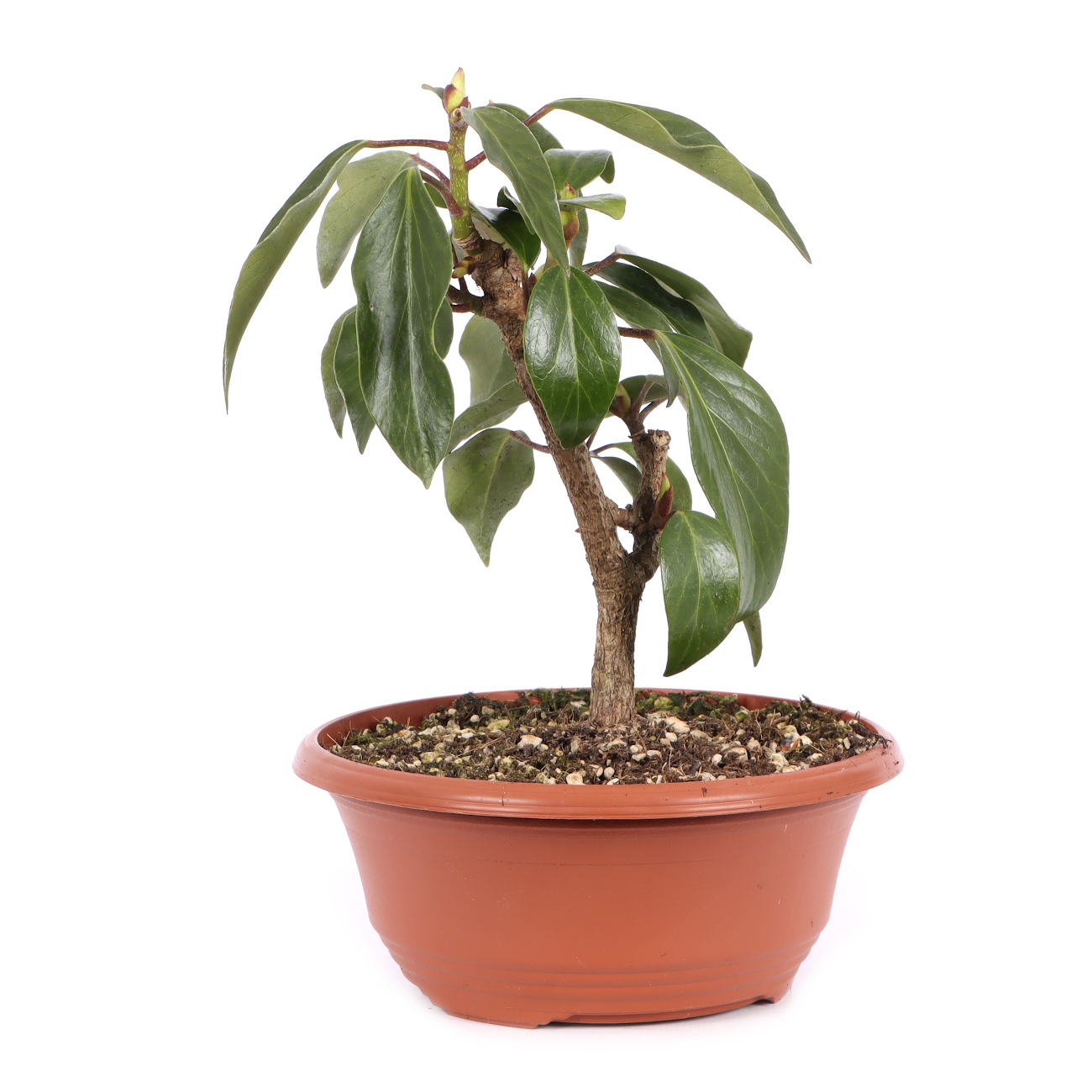 Wie alle Efeu-Arten ist auch der Strauch-Efeu anspruchslos, robust und schnittverträglich. Als Bonsai eignet er sich besonders durch seinen strauchartigen Wuchs bzw. die damit verbundene Ausbildung von einem Stamm. Durch einen regelmäßigen Rückschnitt verzweigt sich die Pflanze recht gut und bildet schnell eine dichte Krone. Die glänzenden Blätter, die weißgrünen Blüten und schwarzen Früchte im Herbst sorgen dafür, dass die Pflanze zu jederzeit sehr schön anzuschauen ist. Der Strauch-Efeu steht am liebsten möglichst hell aber verträgt ansonsten auch schattige Standorte. Für eine gesunde Entwicklung sollte die Pflanze regelmäßig gedüngt und nach Bedarf gewässert werden. Im Winter darf der Efeu nicht austrocknen und steht am besten windgeschützt.