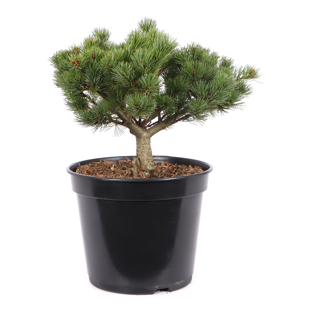 Die Mädchenkiefer hat in Japan aufgrund ihrer Symbolik (Männlichkeit, Stärke, langes Leben) einen sehr hohen Stellenwert und ist vielleicht der beliebteste Bonsai überhaupt. Sie ist robust und bietet viele gestalterische Möglichkeiten. Als Bonsai strahlen sie durch ihren derben Charakter viel Kraft aus. Andererseits zeigt die gestaltete Kiefer im Vergleich zu Laubbäumen wenig Veränderung und vermittelt dem Betrachter dadurch im Jahresverlauf viel Ruhe. Eine gestaltete Kiefer ist im Grunde sehr pflegeleicht. Die neuen Triebe (Kerzen) werden im Mai eingekürzt bzw. mit den Fingern gebrochen und zu dichte Astpartien werden im Spätsommer ausgelichtet. Im Sommer ist ein sonniger Standort sehr von Vorteil. Kiefern sollten nicht zu nass gehalten werden. Bei langen Regenperioden empfiehlt es sich die Pflanze sogar unter ein Dach zu stellen. Drahten und Gestalten kann man das ganze Jahr über. Dies sollte aber nicht mit dem Umtopfen Anfang September zusammen fallen. Außerdem muss die Pflanze nach der Gestaltung am besten frostfrei stehen. Bei dem Substrat verwendet man eine strukturstabile, luftige Mischung und achtet auf das Vorhandensein von Mykorrhiza-Pilzen. Man erkennt den Pilz an einem gleichmäßigen, feinen und weißen Belag, der die Wurzeln umhüllt und im Optimalfall die ganze Erde durchzieht. Kiefern sind sehr frosthart. Trotzdem sollten sie im Winter vor trockenen Winden geschützt werden. Bonsai-Sämlinge von der Mädchenkiefer haben sich in Mitteleuropa nicht bewährt bzw. gehen nach gewisser Zeit meistens ein. Wir bieten ausschließlich Veredelungen an, da die Wurzeln der Unterlage (z.B. Pinus thunbergii) besser an unser Klima angepasst sind.
