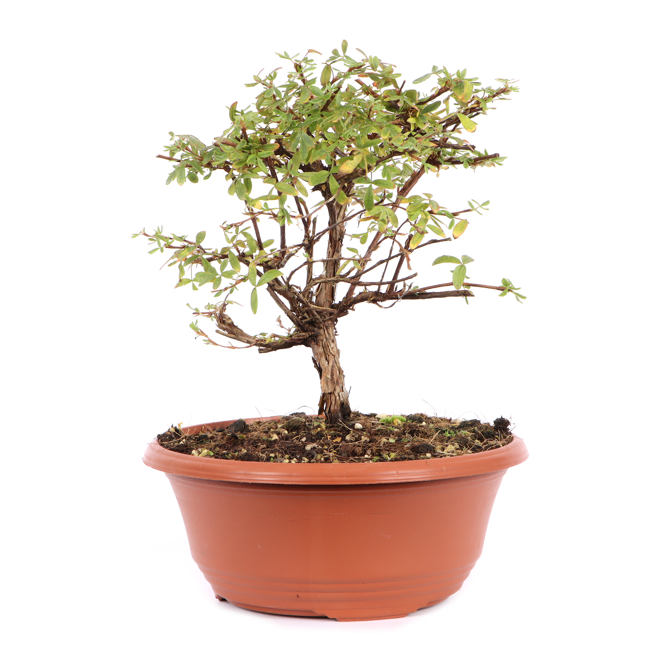 Der Fingerstrauch hat optimale Eigenschaften um ganz besondere Bonsais zu gestalten. Die Blätter sind klein und filigran und verfärben sich gelborange im Herbst. Die Pflanze ist sehr schnittverträglich und bildet viele zum Teil sehr feine Äste. Die Rinde ist rotbraun und löst sich in dünnen Streifen, ähnlich wie bei einem Wacholder. Nicht zuletzt blüht der Fingerstrauch unermüdlich und mehrmals im Jahr. Insgesamt ist die Pflanze auch sehr robust und verzeiht den einen oder anderen Pflegefehler. Der Fingerstrauch sollte für eine optimale Blüte sonnig stehen. An sehr heißen Tagen muss man jedoch auf eine ausreichende Bewässerung achten oder die Pflanze etwas geschützt stellen. Das Wurzelwachstum ist stark und die Pflanzen müssen regelmäßig umgetopft werden.