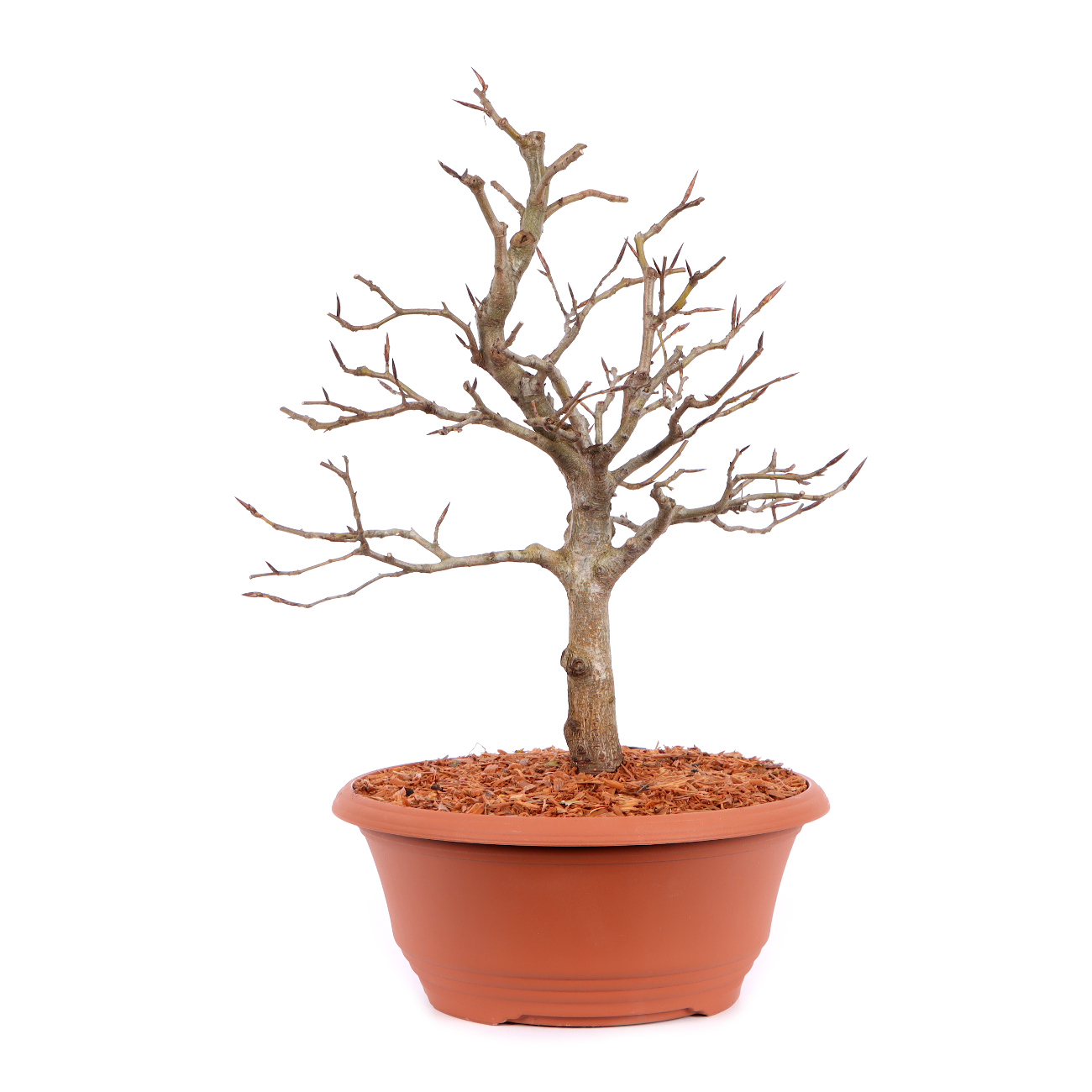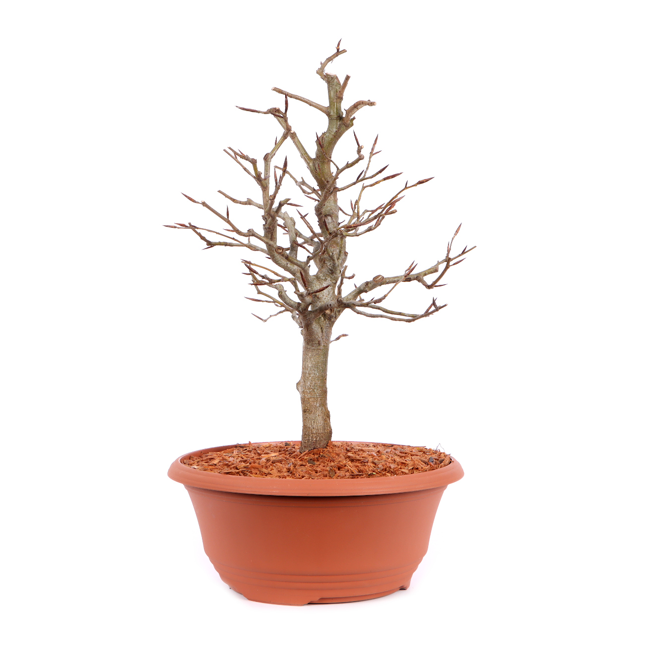 Der Buchenwald sollte jedem Bonsai-Liebhaber vertraut sein. Er ist ein Synonym für die Natur in Deutschland. Entsprechend ist die Beziehung zu der Rotbuche über die Pflege eines Bonsais mehr als verständlich. Die Buche verträgt den Rückschnitt sehr gut und treibt willig auch aus dem alten Holz wieder aus. Bei vitalen und reifen Pflanzen kann der frische Austrieb pinziert werden. Hierbei wird die noch weiche Triebspitze bis auf zwei neue Blätter abgezupft. Dadurch entsteht eine Stauchung und die Internodien des neuen Triebes bleiben kürzer. Äste können gut gedrahtet werden aber der Draht muss unbedingt rechtzeitig entfernt werden. Ansonsten entstehen unansehnliche Narben, die aufgrund der glatten Rinde nicht mehr verschwinden. Die Rotbuche liebt einen sonnigen Platz aber gedeiht auch im Halbschatten. Bei zu großer Hitze und Trockenheit sollte man die Pflanze geschützt stellen. Das Substrat sollte nicht austrocknen, aber Staunässe ist ebenfalls zu vermeiden. Eine Behandlung mit Mykorrhiza und eine organische Düngung sind für den Boden und die Vitalität der Pflanze sehr von Vorteil. Die Buche ist winterhart, aber im Frühjahr spätfrostgefährdet. Nachdem sich die Blätter entfaltet haben, sollte man außerdem auf Wollläuse achten und diese rechtzeitig mit Wasser abspülen.
