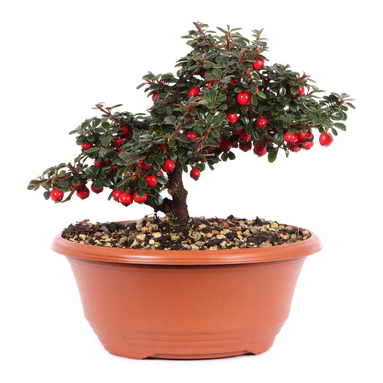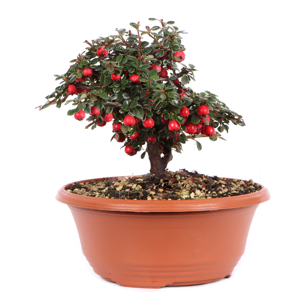 Die Zwergmispel ist wie für die Bonsaigestaltung geschaffen. Ihre Blätter, Blüten und Früchte sind klein, absolut schnittverträglich und treiben immer wieder willig aus. Sie blüht von Mai bis Juni mit kleinen weißen Blüten und bekommt anschließend ab September rote Beeren. Diese haften auch noch im Winter an der Pflanze. Sie ist für alle Gestaltungsformen geeignet, zumal sie das ganze Jahr gedrahtet und geschnitten werden können. Sie kann über viele Jahre hin sehr klein gehalten werden. Die Zwergmispel eignet sich auch als Unterbepflanzung für Wälder oder Landschaften (Saikei). Beim Drahten sollte darauf geachtet werden, dass die kleinen Blätter nicht mit eingedrahtet werden. Dies ist bei der Vielzahl an Blättern natürlich nicht ganz einfach. Die Zwergmispel stellt keine besonderen Standortansprüche, aber man sollte Extreme trotzdem vermeiden. Je heller der Standort ist, umso ausgeprägter ist die Blüten- und Fruchtbildung.
