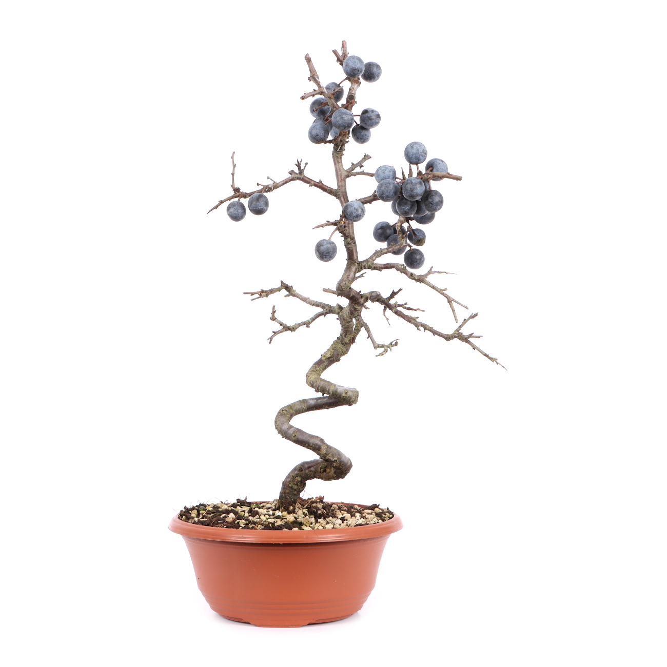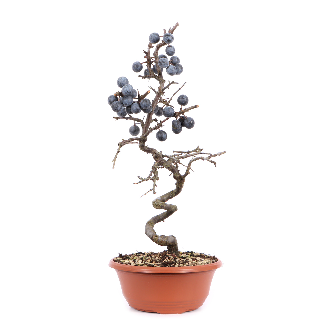 Schlehen entwickeln sich zu unglaublich schönen Bonsais. Alte Exemplare sind reich verzweigt und die tiefschwarze Rinde ist ein toller Kontrast zu den weißen Blüten im Frühjahr. Auch die blauen Früchte in der grünen und später kahlen Krone sind sehr zierend. Darüber hinaus ist die Art sehr robust und anpassungsfähig. Ein heller Standort, eine gute Wasser- und Nährstoffversorgung sowie das regelmäßige Umtopfen sorgen für eine gesunde Entwicklung. Schlehen sind frosthart, aber wie alle Bonsai sind die frischen Wurzeln im Frühjahr spätfrostempfindlich.