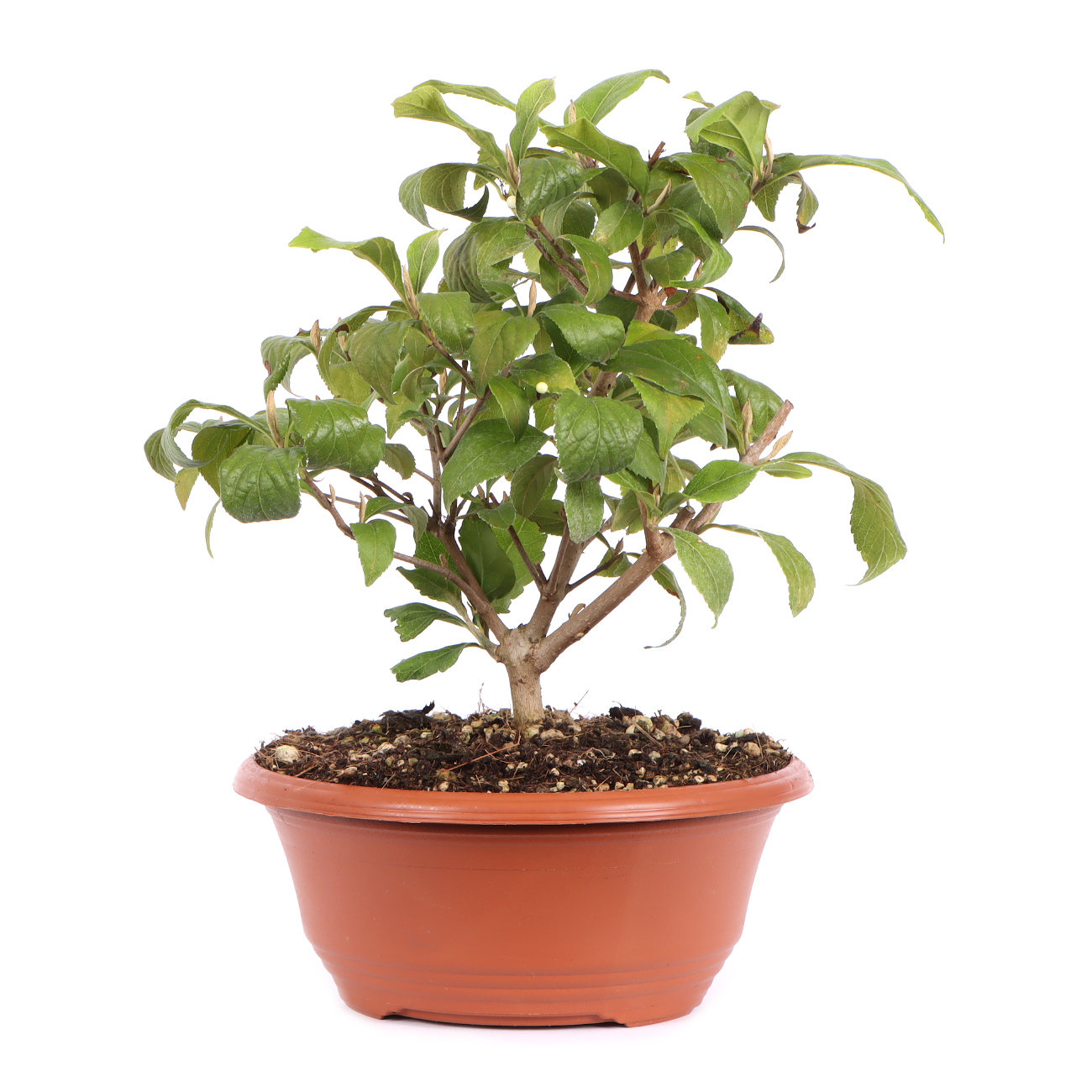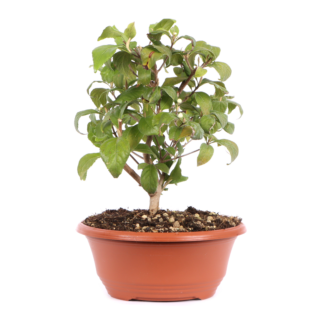 Das Einzigartige an dieser Pflanze sind die violetten Früchte, die an einem Bonsai natürlich besonders zur Geltung kommen. Steht in der Gartenbepflanzung eine weitere Schönfrucht ist die Fruchtbildung übrigens stärker. Ansonsten hat die Pflanze auch eine sehr schöne, gelborange Herbstfärbung und auch die Blüte ist auffällig und gerne von Insekten besucht. Auch als Bonsai wächst die Schönfrucht etwas sparrig und erfordert einen entsprechenden Rückschnitt und evtl. das Drahten von einzelnen Ästen. Man kann aber auch einzelne Individuen als Gruppe zusammenpflanzen und erhält dadurch eine sehr gefällige Gestalt mit guter Verzweigung. Umgetopft wird im Frühjahr vor dem Austrieb der Blätter. Die Wurzeln der Schönfrucht sollten vor zu viel Frost geschützt werden!