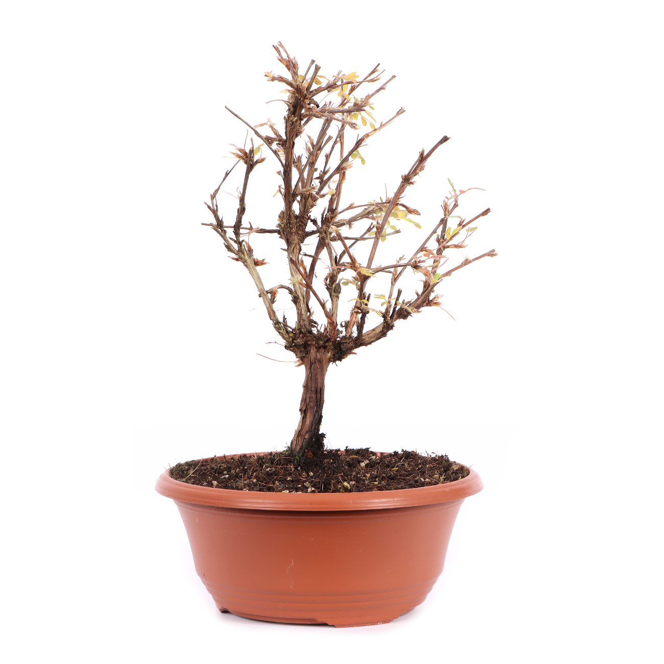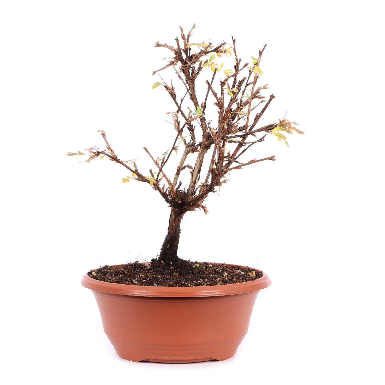 Der Fingerstrauch hat optimale Eigenschaften um ganz besondere Bonsais zu gestalten. Die Blätter sind klein und filigran und verfärben sich gelborange im Herbst. Die Pflanze ist sehr schnittverträglich und bildet viele zum Teil sehr feine Äste. Die Rinde ist rotbraun und löst sich in dünnen Streifen, ähnlich wie bei einem Wacholder. Nicht zuletzt blüht der Fingerstrauch unermüdlich und mehrmals im Jahr. Insgesamt ist die Pflanze auch sehr robust und verzeiht den einen oder anderen Pflegefehler. Der Fingerstrauch sollte für eine optimale Blüte sonnig stehen. An sehr heißen Tagen muss man jedoch auf eine ausreichende Bewässerung achten oder die Pflanze etwas geschützt stellen. Das Wurzelwachstum ist stark und die Pflanzen müssen regelmäßig umgetopft werden.