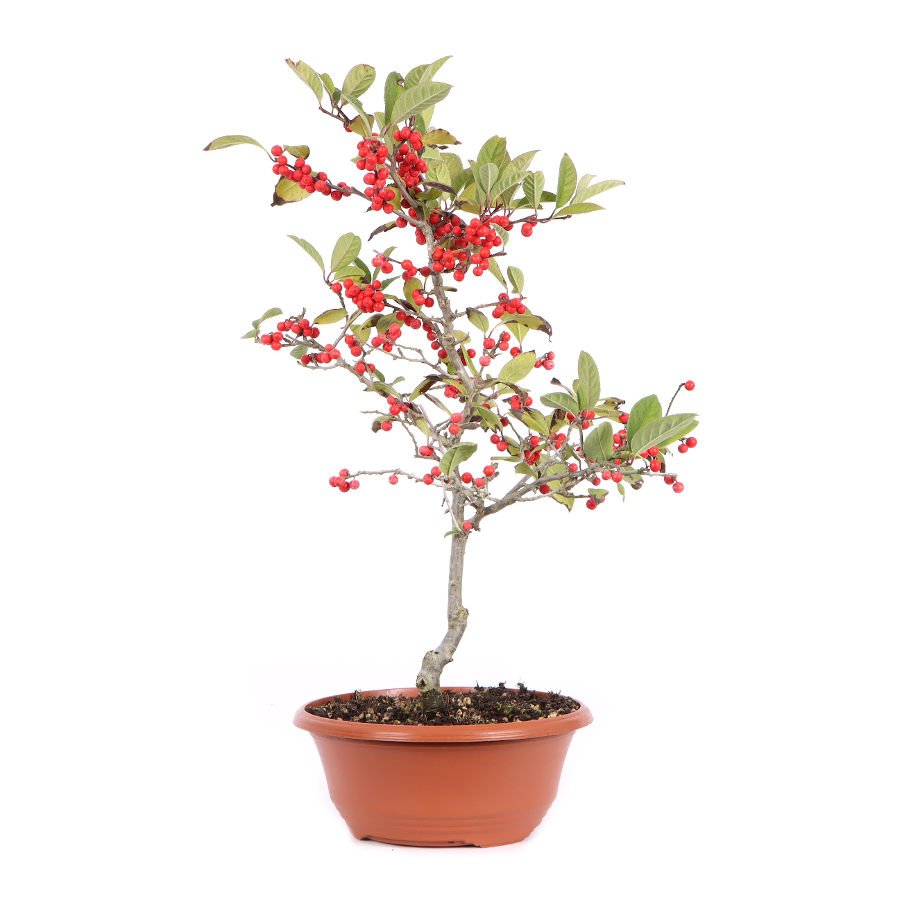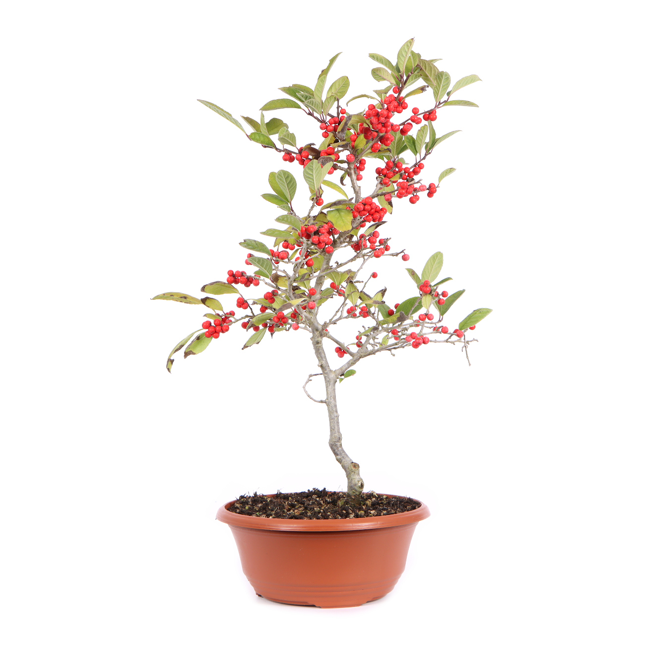 Als Bonsai ist die Winterbeere aufgrund ihres Fruchtschmuckes sehr beliebt. Durch den Blattabwurf im Herbst kommen die knallroten, kleinen Früchte an den Bäumen besonders gut zur Geltung. Für die Fruchtbildung benötigt man im direkten Umfeld eine männliche Pflanze dieser Art bzw. Gattung. Die beste Befruchtung erzielt man jedoch durch das Zusammenstellen von einer weiblichen und männlichen Pflanze direkt während der Blütezeit. Dann kann man gut beobachten, wie besonders Schwebfliegen die Bestäubung übernehmen. Eine Blütenbildung findet sich manchmal schon an dreijährigen Pflanzen. Dazu sollte man die frischen Triebe ab August aber nicht mehr schneiden, da sich an ihnen die Blütenknospen für das nächste Jahr bilden. Winterbeeren sind ansonsten schnittverträglich und bilden eine feine und dichte Verzweigung. Das Drahten und Biegen von Ästen muss sehr vorsichtig geschehen. Die Äste sind hart und spröde und Drahtspuren würden aufgrund der glatten Rinde immer sichtbar bleiben. Auch wenn es keine typischen Stechpalmen sind, lieben sie einen halbschattigen Standort im Sommer. Die feinen Wurzeln vertragen keine Staunässe und es muss entsprechend aufmerksam gegossen werden. Im Winter steht die Pflanze am besten geschützt und frostfrei.