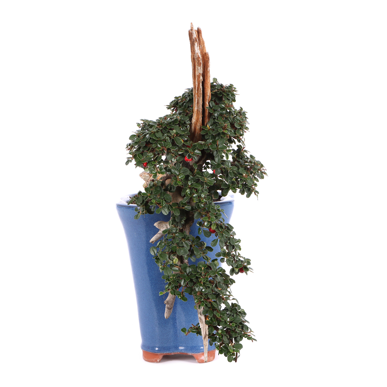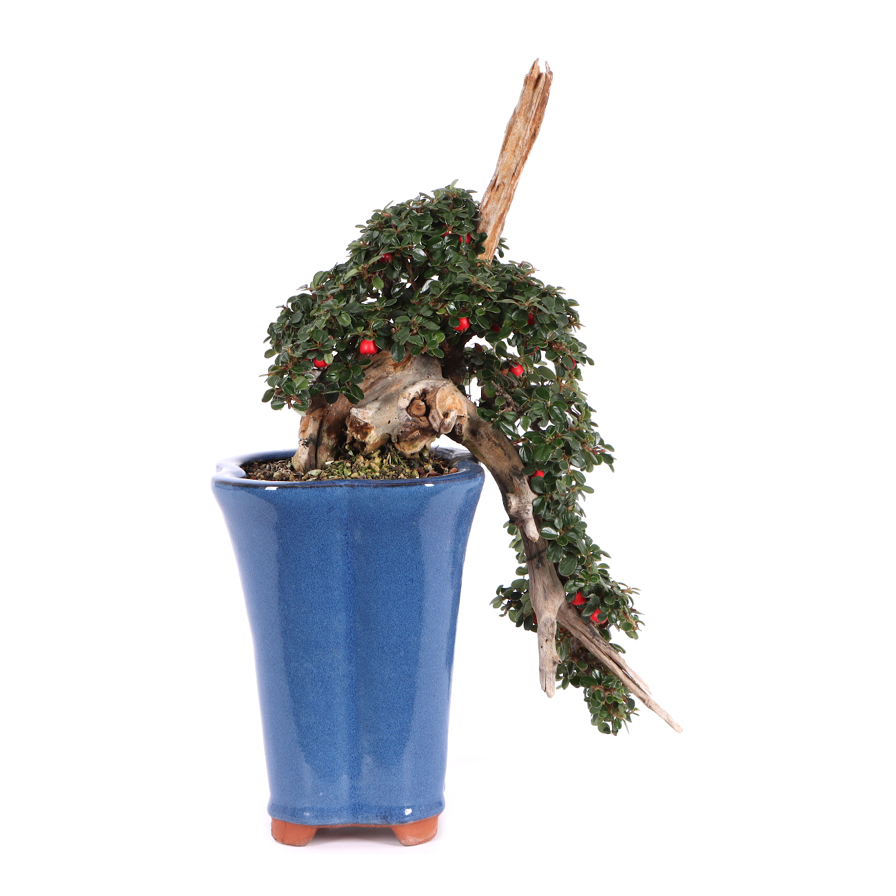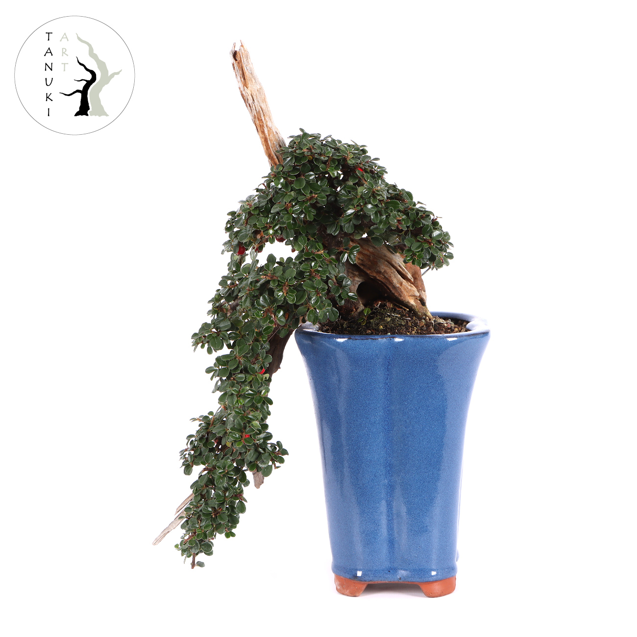 Die Zwergmispel ist wie für die Bonsaigestaltung geschaffen. Ihre Blätter, Blüten und Früchte sind klein, absolut schnittverträglich und treiben immer wieder willig aus. Sie blüht von Mai bis Juni mit kleinen weißen Blüten und bekommt anschließend ab September rote Beeren. Diese haften auch noch im Winter an der Pflanze. Sie ist für alle Gestaltungsformen geeignet, zumal sie das ganze Jahr gedrahtet und geschnitten werden können. Sie kann über viele Jahre hin sehr klein gehalten werden. Die Zwergmispel eignet sich auch als Unterbepflanzung für Wälder oder Landschaften (Saikei). Beim Drahten sollte darauf geachtet werden, dass die kleinen Blätter nicht mit eingedrahtet werden. Dies ist bei der Vielzahl an Blättern natürlich nicht ganz einfach. Die Zwergmispel stellt keine besonderen Standortansprüche, aber man sollte Extreme trotzdem vermeiden. Je heller der Standort ist, umso ausgeprägter ist die Blüten- und Fruchtbildung.