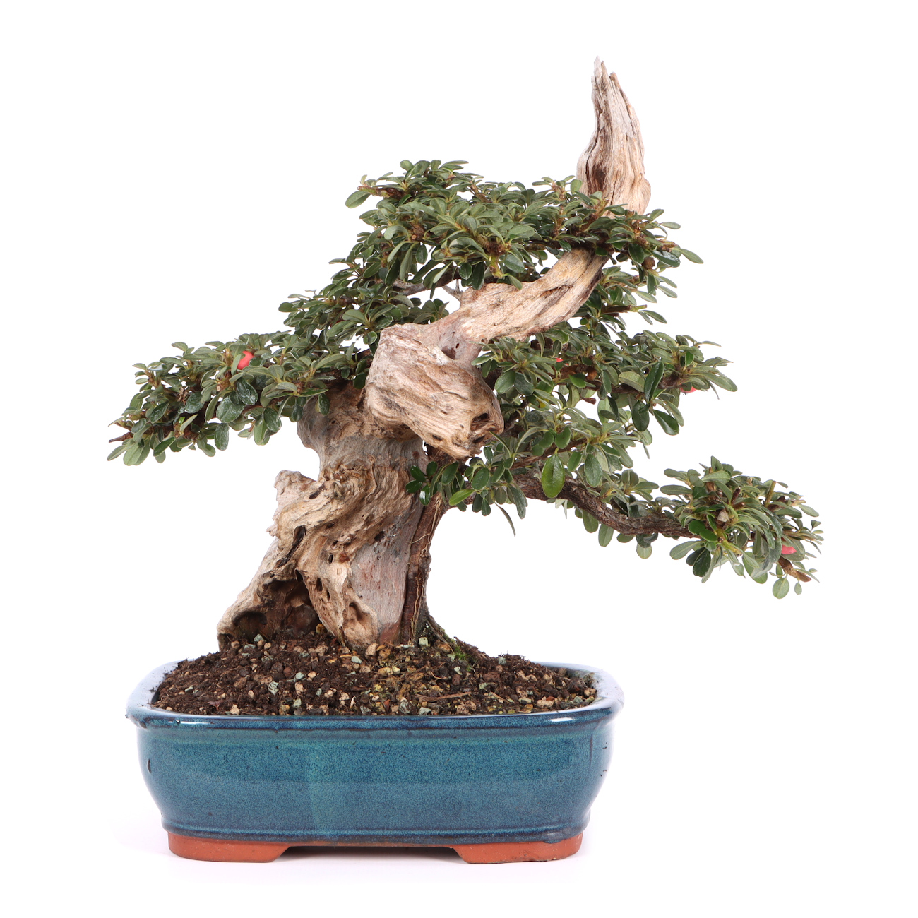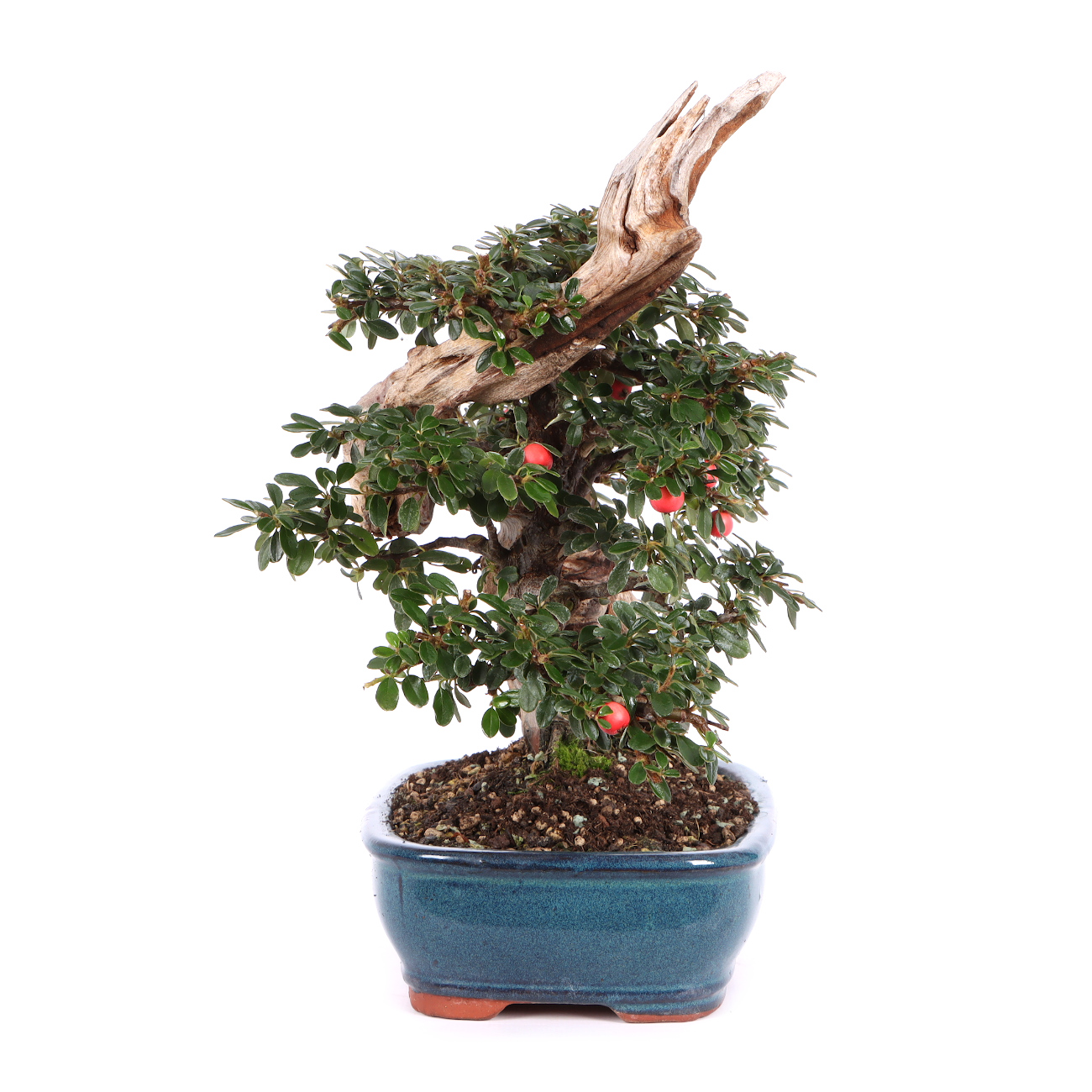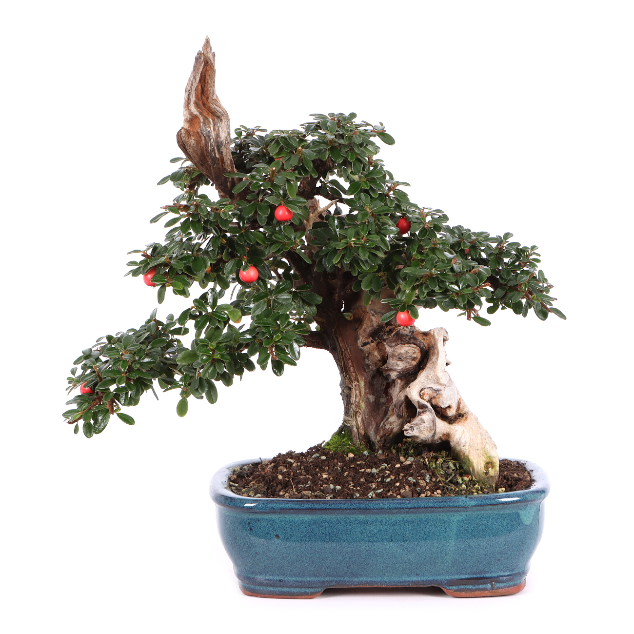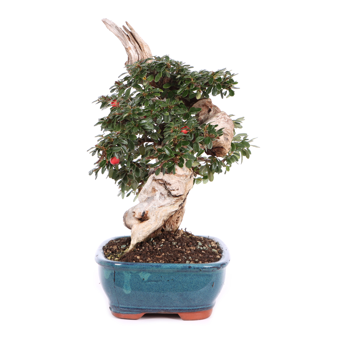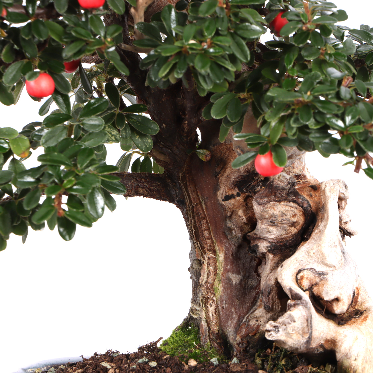 Die Zwergmispel ist wie für die Bonsaigestaltung geschaffen. Ihre Blätter, Blüten und Früchte sind klein, absolut schnittverträglich und treiben immer wieder willig aus. Sie blüht von Mai bis Juni mit kleinen weißen Blüten und bekommt anschließend ab September rote Beeren. Diese haften auch noch im Winter an der Pflanze. Sie ist für alle Gestaltungsformen geeignet, zumal sie das ganze Jahr gedrahtet und geschnitten werden kann. Sie kann über viele Jahre hin sehr klein gehalten werden. Die Zwergmispel eignet sich auch als Unterbepflanzung für Wälder oder Landschaften (Saikei). Beim Drahten sollte darauf geachtet werden, dass die kleinen Blätter nicht mit eingedrahtet werden. Dies ist bei der Vielzahl an Blättern natürlich nicht ganz einfach. Die Zwergmispel stellt keine besonderen Standortansprüche, jedoch sollte man Extreme vermeiden. Je heller der Standort ist, umso ausgeprägter ist die Blüten- und Fruchtbildung.