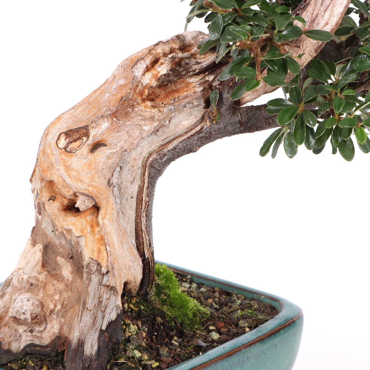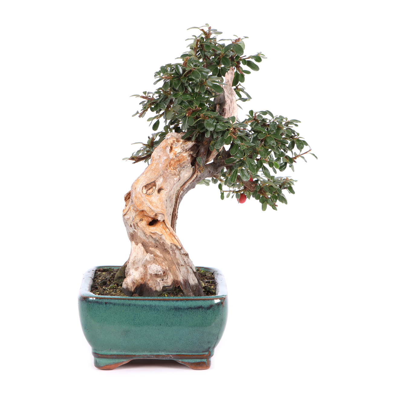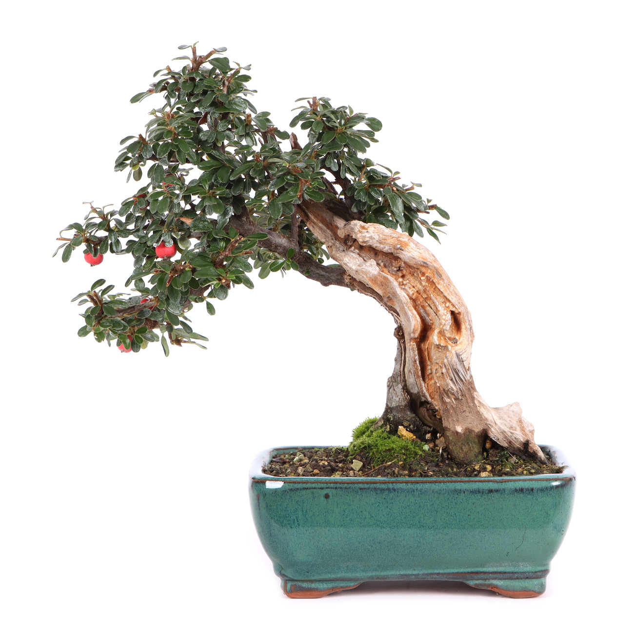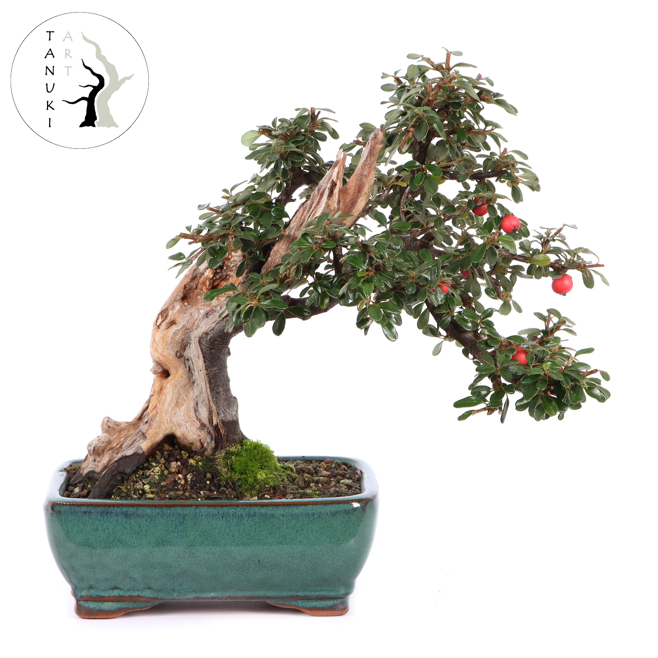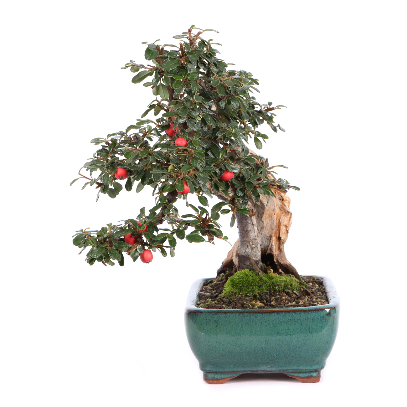 Die Zwergmispel ist wie für die Bonsaigestaltung geschaffen. Ihre Blätter, Blüten und Früchte sind klein, absolut schnittverträglich und treiben immer wieder willig aus. Sie blüht von Mai bis Juni mit kleinen weißen Blüten und bekommt anschließend ab September rote Beeren. Diese haften auch noch im Winter an der Pflanze. Sie ist für alle Gestaltungsformen geeignet, zumal sie das ganze Jahr gedrahtet und geschnitten werden kann. Sie kann über viele Jahre hin sehr klein gehalten werden. Die Zwergmispel eignet sich auch als Unterbepflanzung für Wälder oder Landschaften (Saikei). Beim Drahten sollte darauf geachtet werden, dass die kleinen Blätter nicht mit eingedrahtet werden. Dies ist bei der Vielzahl an Blättern natürlich nicht ganz einfach. Die Zwergmispel stellt keine besonderen Standortansprüche, jedoch sollte man Extreme vermeiden. Je heller der Standort ist, umso ausgeprägter ist die Blüten- und Fruchtbildung.