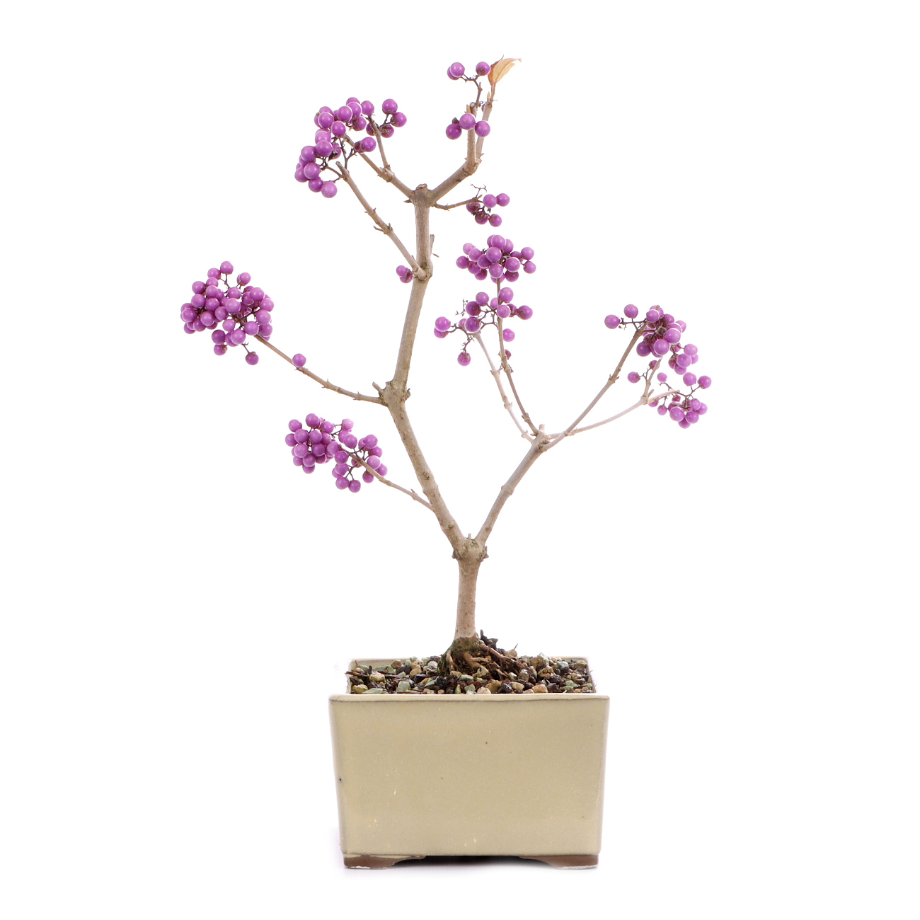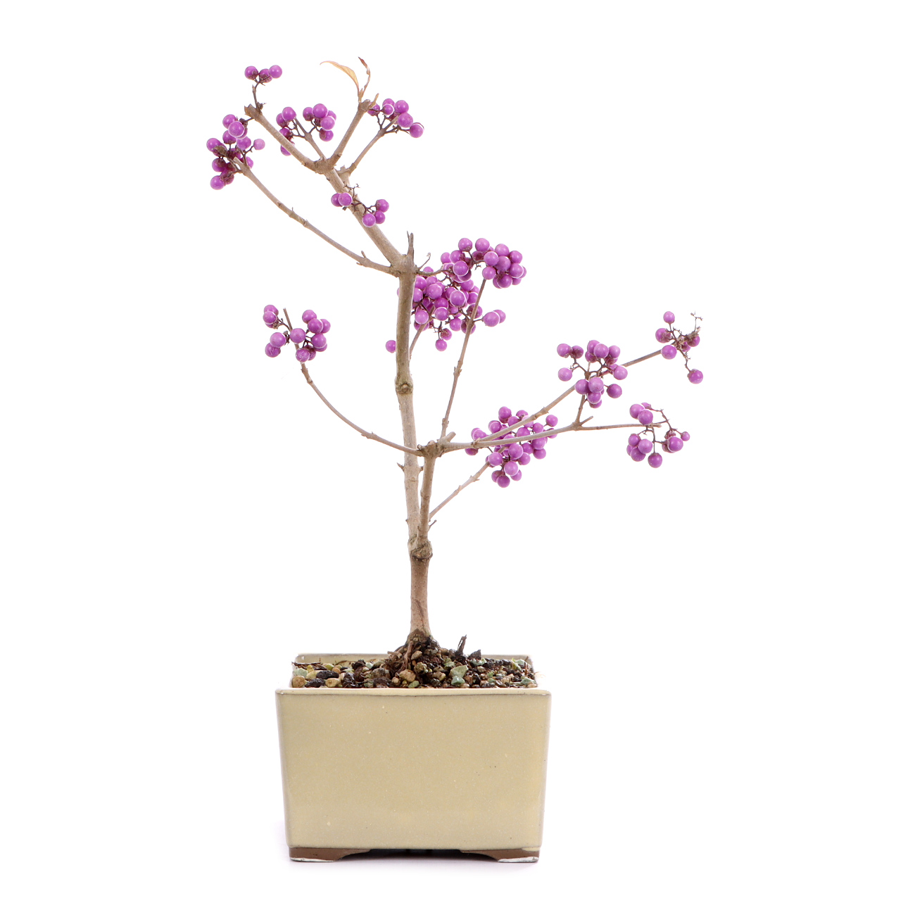Das Einzigartige an dieser Pflanze sind die violetten Früchte, die an einem Bonsai natürlich besonders zur Geltung kommen. Steht in der Gartenbepflanzung eine weitere Schönfrucht, ist die Fruchtbildung übrigens stärker. Ansonsten hat die Pflanze auch eine sehr schöne, gelborange Herbstfärbung und auch die Blüte ist auffällig und gerne von Insekten besucht. Auch als Bonsai wächst die Schönfrucht etwas sparrig und erfordert einen entsprechenden Rückschnitt und evtl. das Drahten von einzelnen Ästen. Man kann aber auch einzelne Individuen als Gruppe zusammenpflanzen und erhält dadurch eine sehr gefällige Gestalt mit guter Verzweigung. Umgetopft wird im Frühjahr vor dem Austrieb der Blätter. Die Wurzeln der Schönfrucht sollten vor zu viel Frost geschützt werden!