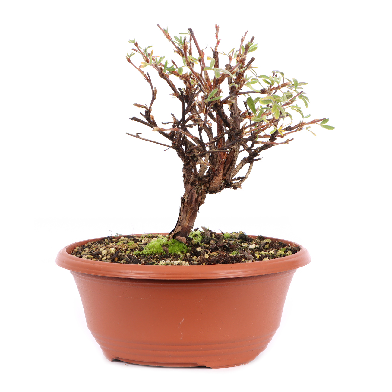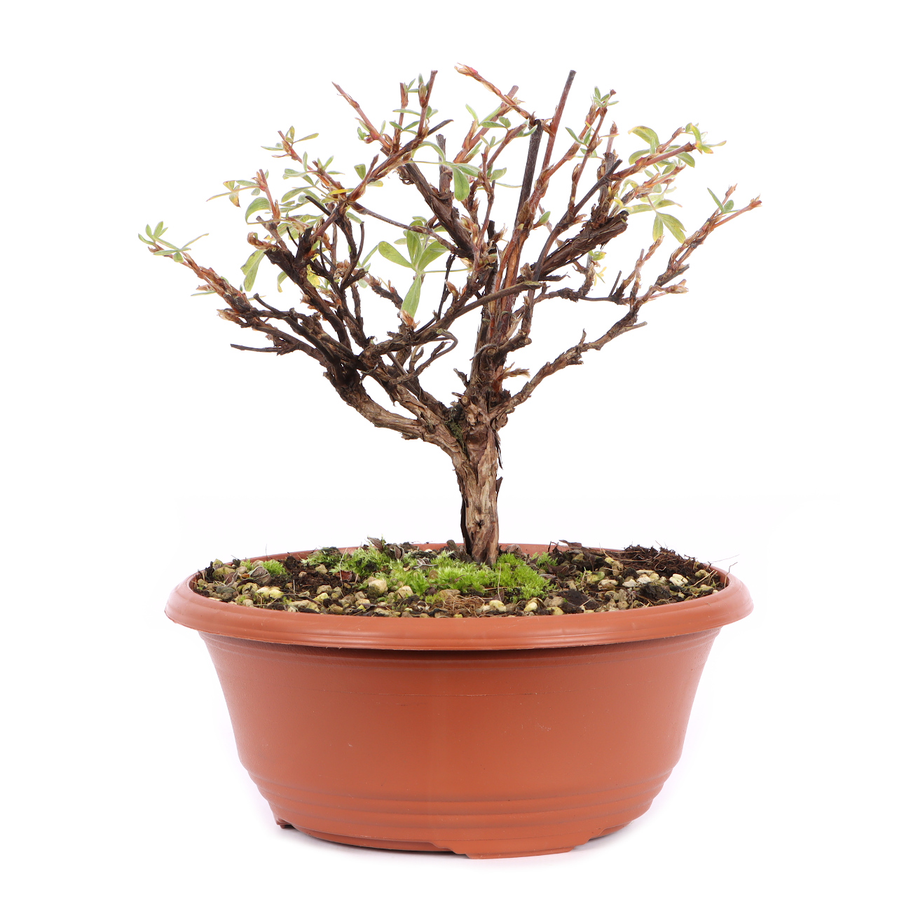 Der Fingerstrauch hat optimale Eigenschaften um ganz besondere Bonsais zu gestalten. Die Blätter sind klein und filigran und verfärben sich gelborange im Herbst. Die Pflanze ist sehr schnittverträglich und bildet viele zum Teil sehr feine Äste. Die Rinde ist rotbraun und löst sich in dünnen Streifen, ähnlich wie bei einem Wacholder. Nicht zuletzt blüht der Fingerstrauch unermüdlich und mehrmals im Jahr. Insgesamt ist die Pflanze auch sehr robust und verzeiht den einen oder anderen Pflegefehler. Der Fingerstrauch sollte für eine optimale Blüte sonnig stehen. An sehr heißen Tagen muss man jedoch auf eine ausreichende Bewässerung achten oder die Pflanze etwas geschützt stellen. Das Wurzelwachstum ist stark und die Pflanzen müssen regelmäßig umgetopft werden.