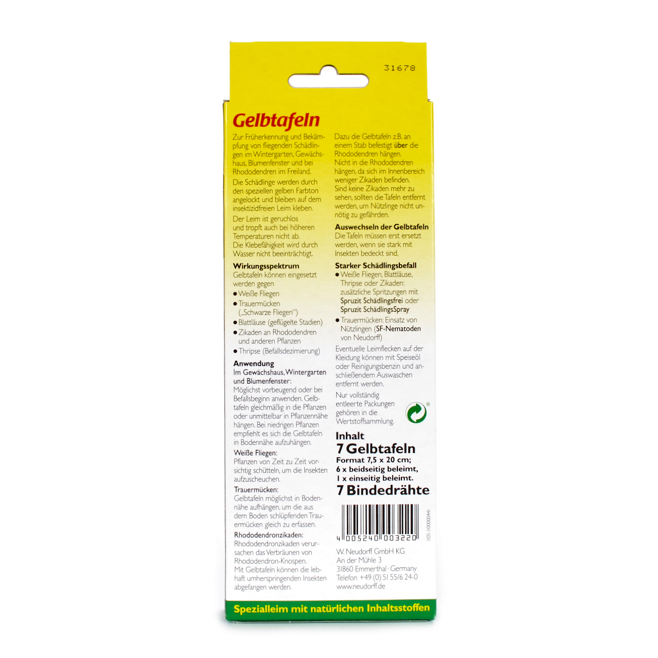 These double-sided adhesive plastic boards are used in an environmentally friendly and non-toxic way to control whitefly, fungus gnat and winged aphid. The boards are simply hung near the crop plants. The yellow color particularly attracts the pests and the glue holds them securely. The adhesiveness of the special glue is not affected by water. Replacing the boards is necessary only when they are predominantly covered with insects.