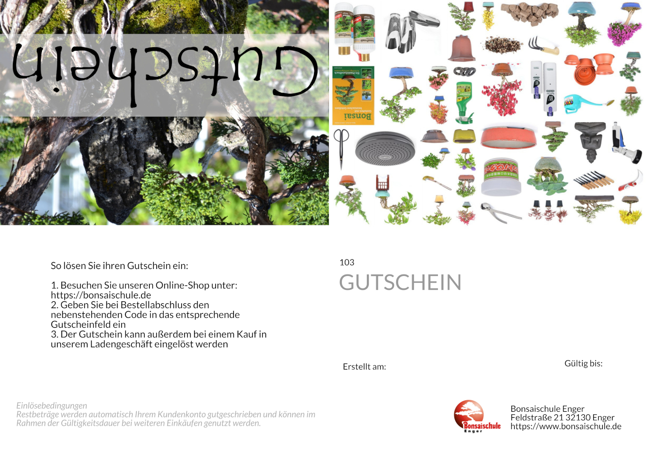 Gutscheine sind immer eine tolle Geschenkidee für jeden Anlass. Bonsaifreunde können damit durch unser umfangreiches Sortiment an Bonsai und Zubehör stöbern, um sich etwas Schönes oder Nützliches nach ihrem Geschmack oder Bedarf herauszusuchen.
