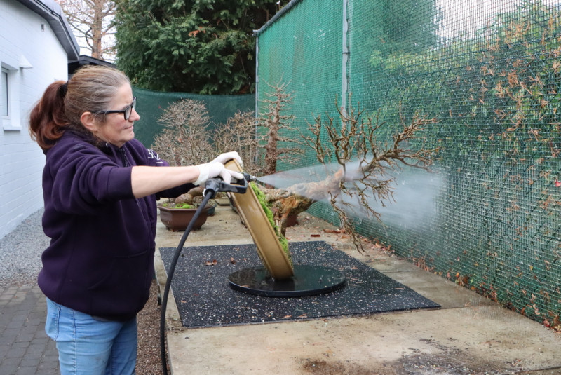 Alte Blätter und Nadeln sind ebenfalls zu entfernen. Anschließend sollte die Pflanze gründlich gereinigt werden. Dazu kann man eine Bürste verwenden um grobe Verunreinigungen und Moos zu entfernen. Die Bürste sollte dabei jedoch nicht die Rinde verletzen. Am besten eignet sich hier also eine Kunststoff- oder Messingbürsten. Wir empfehlen die Verwendung eines Hochdruckreinigers für eine schnelle und effiziente Pflanzenreinigung. Dabei muss man jedoch darauf achten, dass mit wenig Wasserdruck gearbeitet wird damit nur der Moos-, Flechten- und Algenbewuchs entfernt und nicht die Rinde beschädigt wird.