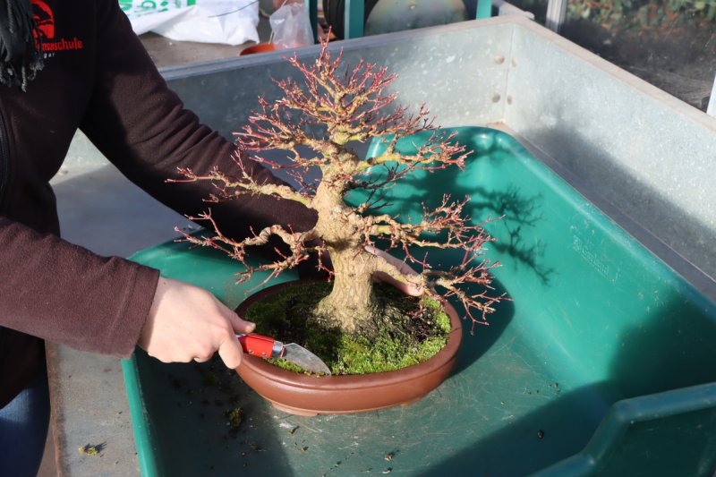 Just as with the crown of the tree, emphasis should be placed on a good root system structure. When repotting, the roots are first untangled with a root claw. This is done by working from the trunk outward without tearing the roots. The loosely hanging roots can then be shortened with sharp scissors. Thicker roots can also be cut with pliers. Heavy cuts are then best treated with a special root paste.