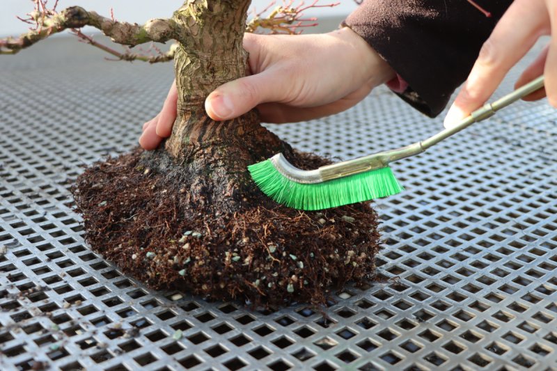 For a beautiful root base, it is also important to encourage the lateral roots and not the lower roots. For this purpose, the bottom of the root ball is shortened more. However, there should always be enough fine roots left on the tree to ensure that the plant will grow. The root base should then be cleaned with a brush and water before potting. Visually disturbing roots can now also be removed completely, if the tree can physiologically do without them.