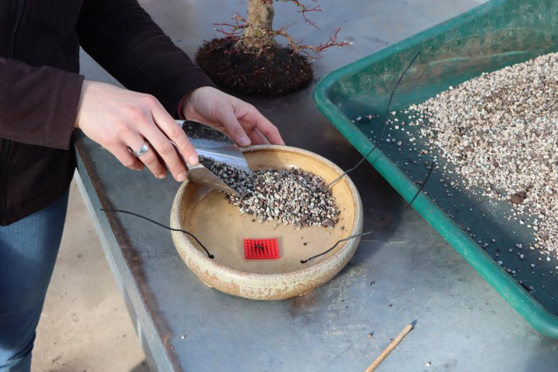 Special bonsai substrate (e.g. TerraSai) is then poured into the finished prepared pot. It should be a structurally stable mixture adapted to the plant species and developmental stage. Only enough substrate is poured in so that the tree subsequently has the appropriate height in the pot. The root base should be neither below nor above the edge of the pot. Before the tree is inserted, it is recommended to use a starter fertilizer (e.g. BioGold Classic). Conifers in particular can now also be inoculated very well with a mycorrhiza fungus (e.g. Vitalin).