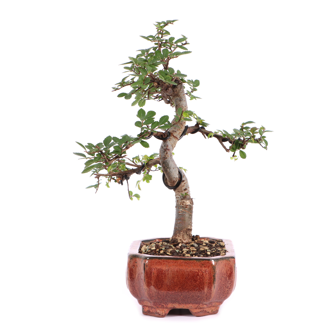 There is hardly any other plant that is so suitable for bonsai culture as the Chinese elm. It is very easy to cut and particularly easy to care for. It tolerates a wide variety of site conditions and is tolerant of cultural errors. Due to the small leaves, the proportions appear very harmonious within the design. This species can also be raised to expressive trees simply by pruning. The branches can also be wired without any problems. For healthy growth, we recommend a bright location (in summer also outdoors) as well as adequate irrigation and fertilization. New shoots are initially allowed to grow, but before they get too long or begin to harden, they are cut back. This leaves 2 to 3 new leaves on the shoot. In winter, the Chinese elm is best placed a little cooler (5 ° C). In warmer temperatures, it also grows in winter, which, due to the lack of light, usually leads to elongated and unsuitable shoots.
