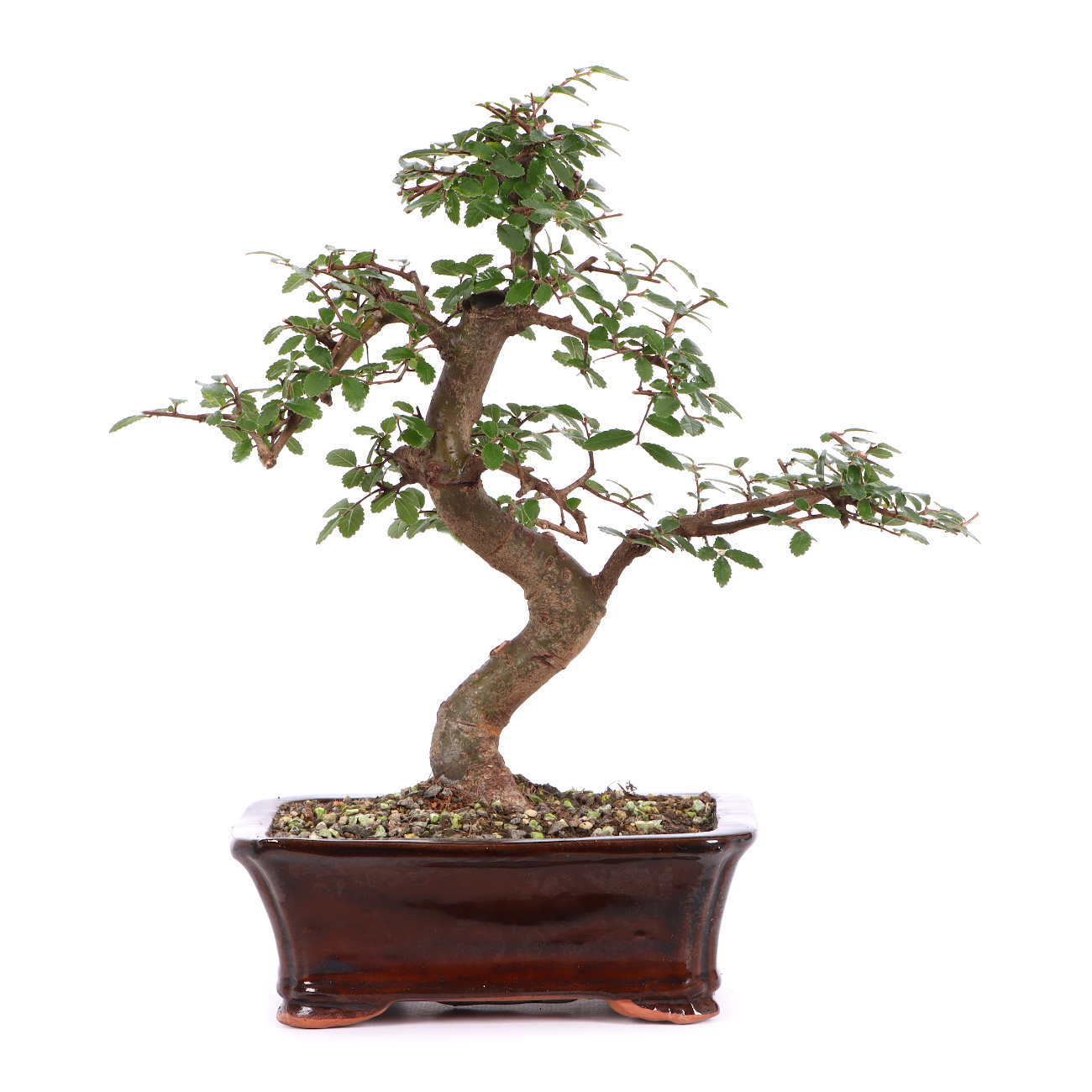 There is hardly any other plant that is so suitable for bonsai culture as the Chinese elm. It is very easy to cut and particularly easy to care for. It tolerates a wide variety of site conditions and is tolerant of cultural errors. Due to the small leaves, the proportions appear very harmonious within the design. This species can also be raised to expressive trees simply by pruning. The branches can also be wired without any problems. For healthy growth, we recommend a bright location (in summer also outdoors) as well as adequate irrigation and fertilization. New shoots are initially allowed to grow, but before they get too long or begin to harden, they are cut back. This leaves 2 to 3 new leaves on the shoot. In winter, the Chinese elm is best placed a little cooler (5 ° C). In warmer temperatures, it also grows in winter, which, due to the lack of light, usually leads to elongated and unsuitable shoots.