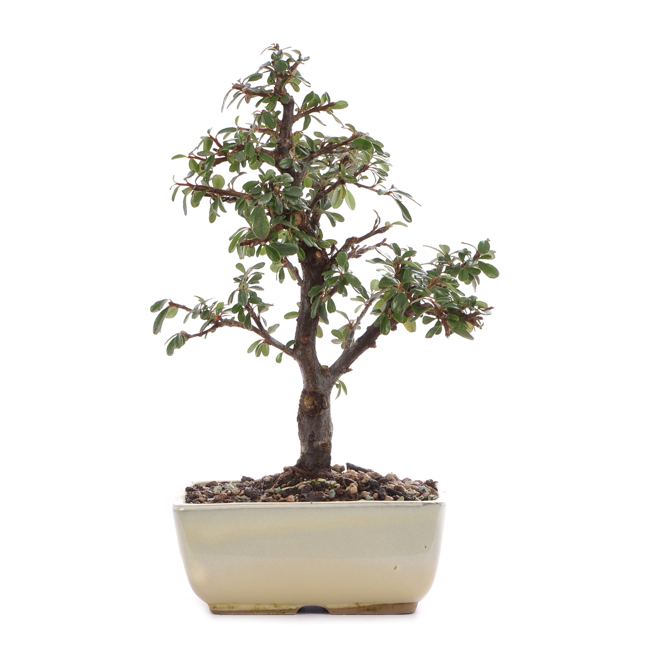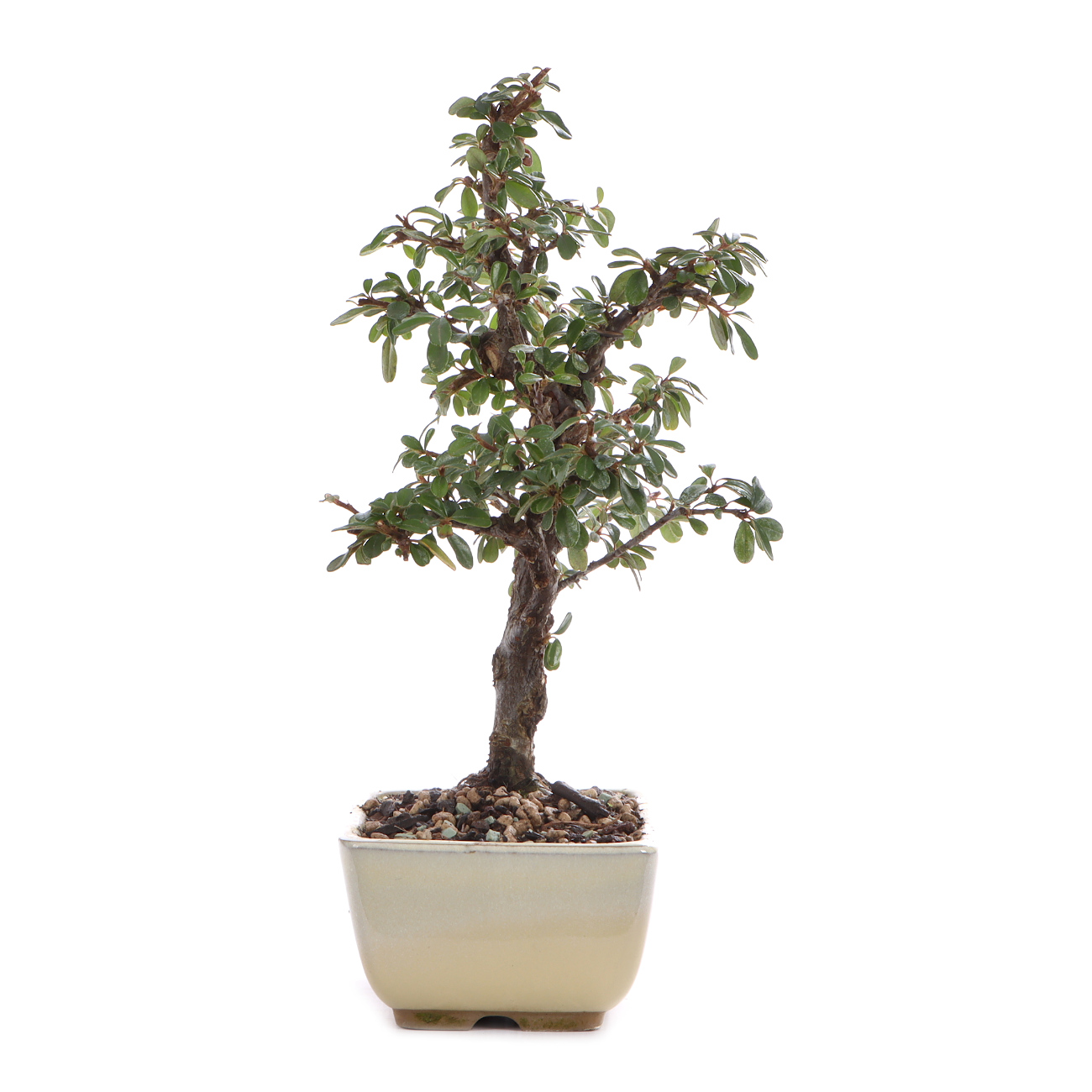 The bearberry cotoneaster is made for bonsai design. Its leaves, flowers and fruits are small, absolutely compatible with pruning and will sprout again and again. It blooms from May to June with small white flowers and then gets red berries from September. These stick to the plant even in winter. It is suitable for all forms of design, especially since they can be wired and cut all year round. It can be kept very small for many years. The bearberry cotoneaster is also suitable as underplanting for forests or landscapes (Saikei). When wiring, care should be taken that the small leaves are not wired in. This is of course not that easy with the large number of leaves. The cotoneaster does not make any special demands on its location, but extremes should still be avoided. The lighter the location, the more pronounced the bloom and fruit formation.