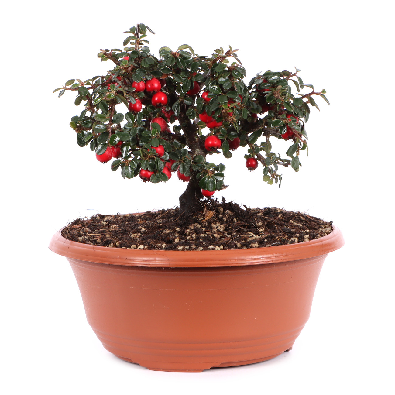 The dwarf creeping cotoneaster is made for bonsai design. Its leaves, flowers and fruits are small, absolutely compatible with pruning and will sprout again and again. It blooms from May to June with small white flowers and then gets red berries from September. These stick to the plant even in winter. It is suitable for all forms of design, especially since they can be wired and cut all year round. It can be kept very small for many years. The dwarf creeping cotoneaster is also suitable as underplanting for forests or landscapes (Saikei). When wiring, care should be taken that the small leaves are not wired in. This is of course not that easy with the large number of leaves. The cotoneaster does not make any special demands on its location, but extremes should still be avoided. The lighter the location, the more pronounced the bloom and fruit formation.