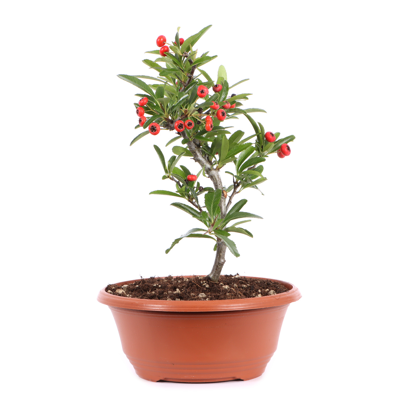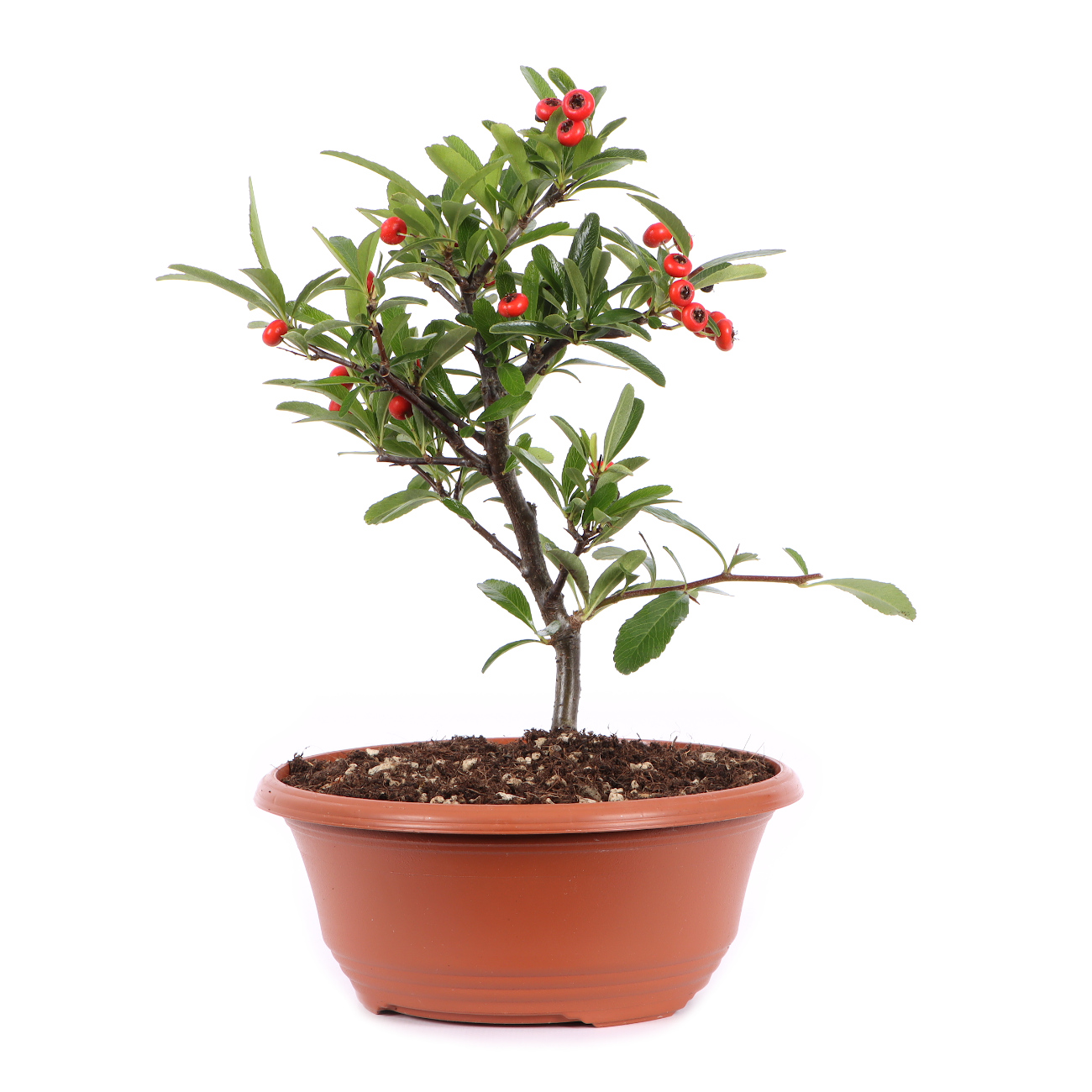 The mall-leaved firethorn grows in its native China as a bulky and evergreen shrub. The leaves are glossy green, narrow and oblong. The bark is dark gray and the shoots are thorny. From May to June the firethorn blooms in white panicles and then forms pea-sized, red fruits that adhere to the plants until spring.