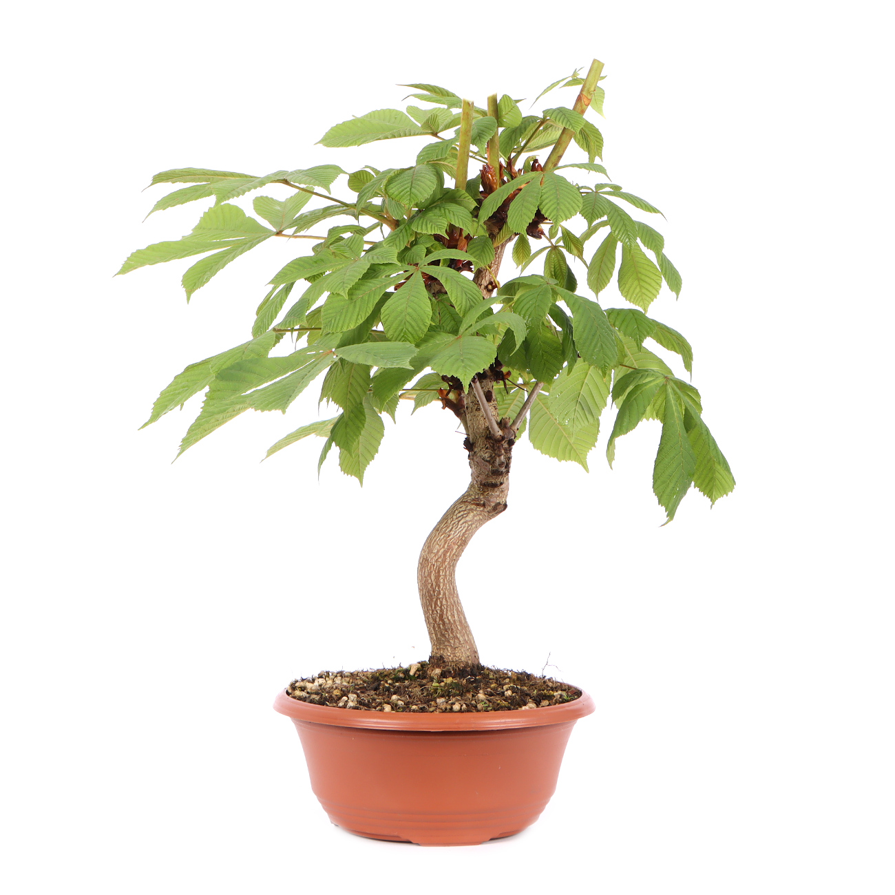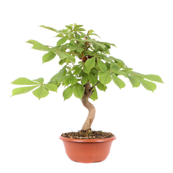 Even if some authors skip chestnuts in their books or even are of the opinion that chestnuts cannot be made into bonsai, we take the opposite view. The design is certainly not very easy, but that is precisely where it is particularly attractive. There are many red Japanese maples and Japanese pine trees, but not chestnuts. You have to start early with the design of the bonsai, because if you let the chestnut grow as it wants, it will be one meter high after a year. It has been shown that removing the thick, sticky summit bud in autumn strengthens the side buds and thus enables better branching in spring. If the branching is still not good, a complete leaf cut can be made in June. Shape cutting and wiring are then also possible. After about 2 weeks, the smaller after-shoot begins. During this time it is advisable to place the chestnut a little more shade, otherwise the location should be bright and sunny. As with all bonsai, regular fertilization and good soil are very important. Regular repotting is also important, as the chestnut has a very abundant root growth. In summer it can be attacked by leaf blotch disease or the leaf miner. A leaf cut is also recommended here. The chestnut is otherwise very robust and extremely hardy. Since the chestnut is one of the first trees to get its leaves in spring, it must be protected from late frosts.