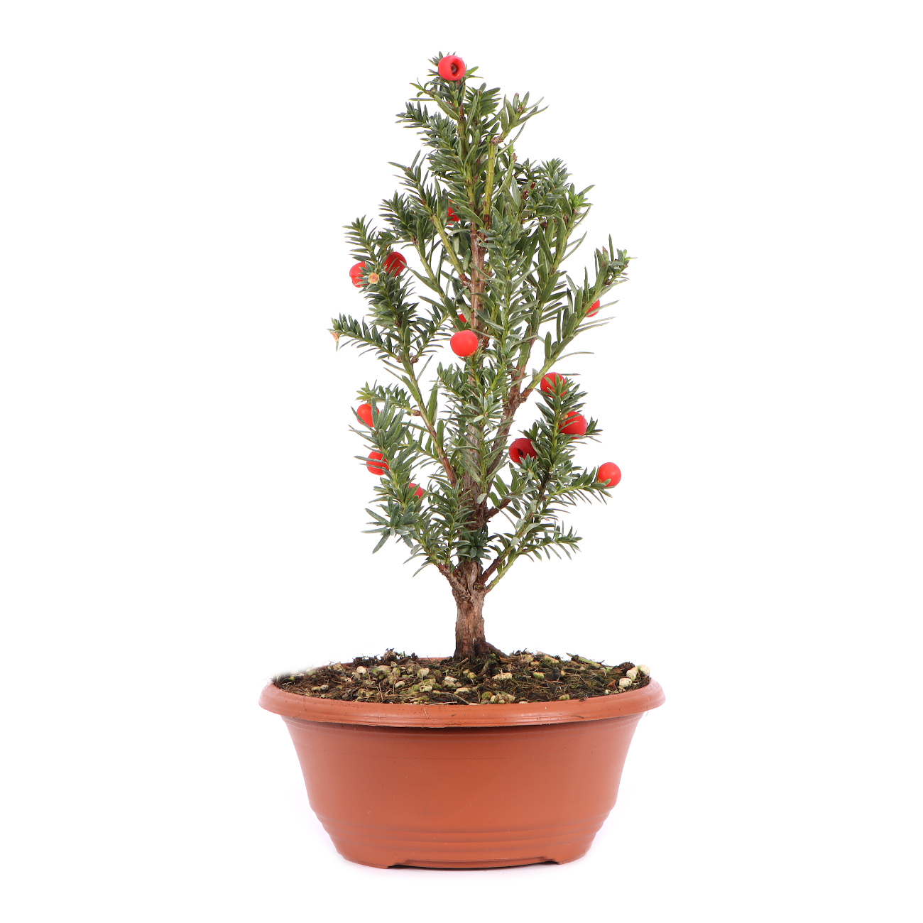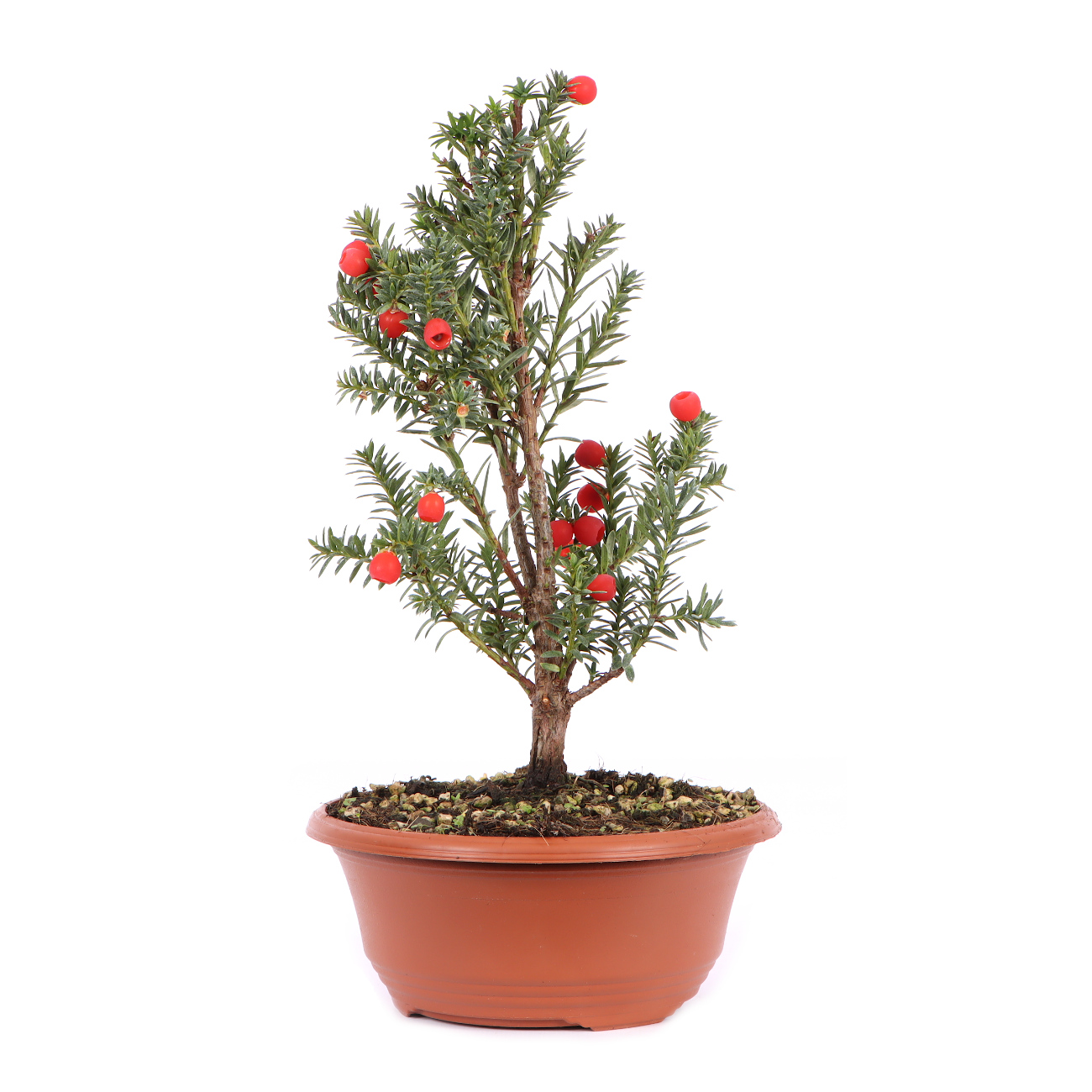 Due to its robustness, strong budding ability (even from the old wood) and fine foliage, the yew offers many possibilities for bonsai design. However, you should wire it in time, when the branches are still young. Later they become very hard and inflexible. Yew can grow both in the shade and in the sun. The only important thing is appropriate watering, avoiding waterlogging at all costs! During the growing season, the long shoots are shortened by plucking. As with almost all conifers, late summer/fall is the best time for root pruning and repotting. Be sure to use a respirator when milling the wood due to toxicity!