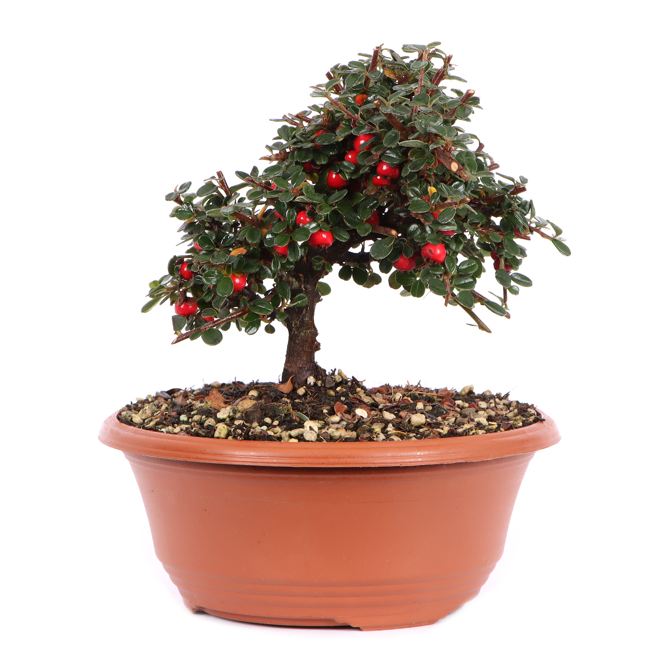 The dwarf creeping cotoneaster is made for bonsai design. Its leaves, flowers and fruits are small, absolutely compatible with pruning and will sprout again and again. It blooms from May to June with small white flowers and then gets red berries from September. These stick to the plant even in winter. It is suitable for all forms of design, especially since they can be wired and cut all year round. It can be kept very small for many years. The dwarf creeping cotoneaster is also suitable as underplanting for forests or landscapes (Saikei). When wiring, care should be taken that the small leaves are not wired in. This is of course not that easy with the large number of leaves. The cotoneaster does not make any special demands on its location, but extremes should still be avoided. The lighter the location, the more pronounced the bloom and fruit formation.